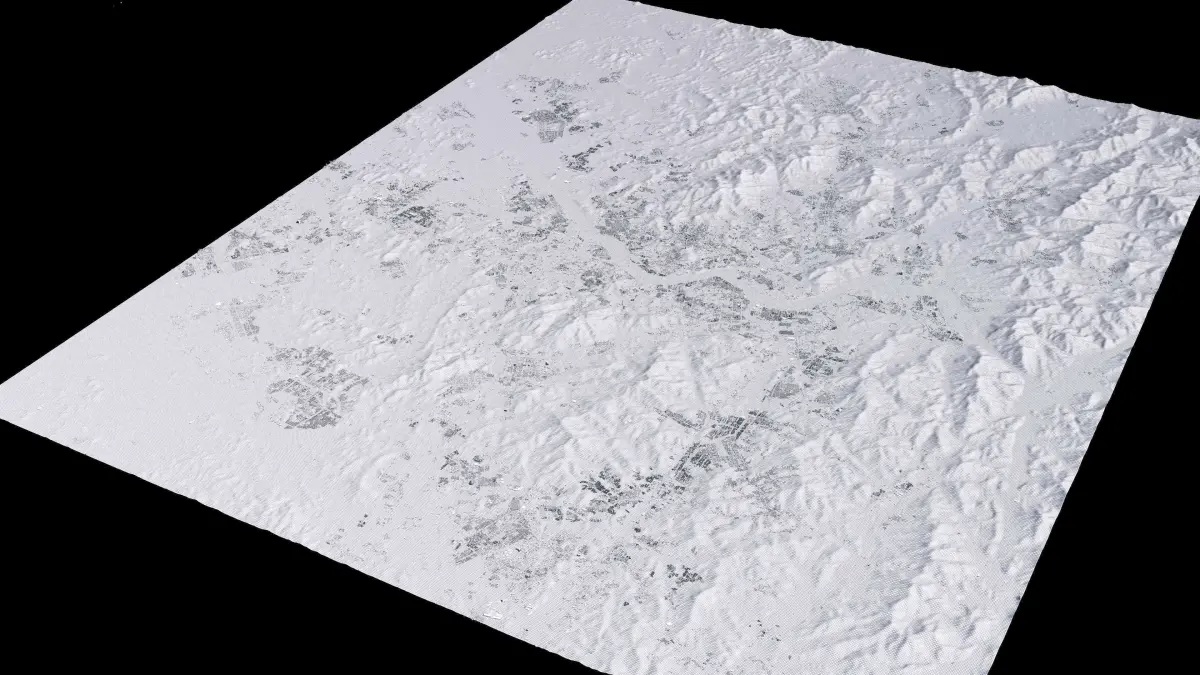 Originally created in Houdini 19. Final images rendered in Houdini. Data source is ASTER GDEM V3, ASTER WATER V1, Open Streep Maps 2022, Copernicus Sentinel 2016.