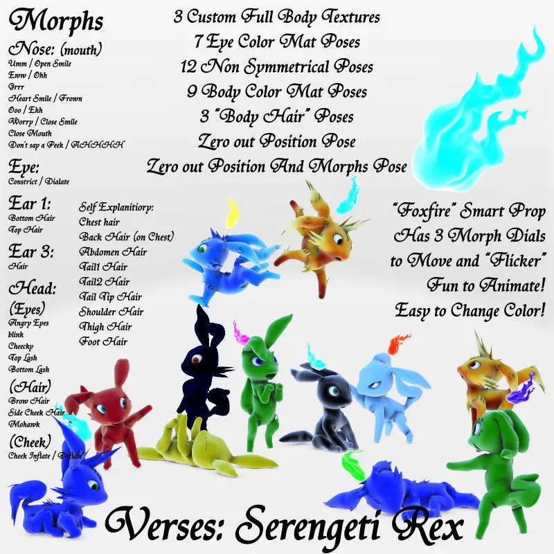 Serengeti Rex comes with 12 non-symmetrical Poses for nonstop fun!Need to breed him to get different colors? No you don't! He comes with 3 hand painted textures and 6 other colors for a total of 9. Combine that with 7 different eye colors and the possibilities are endless!Don't forget about the Foxfire. Foxfire is the little eternal ethereal flame that hovers over Serengeti Rex's head. It has 3 different morph dials so animating is a breeze and LOOKS GREAT! This high resolution smart prop deforms as if it were real fire, and, since it's parented to Serengeti Rex's head, keeping it close by is easy!