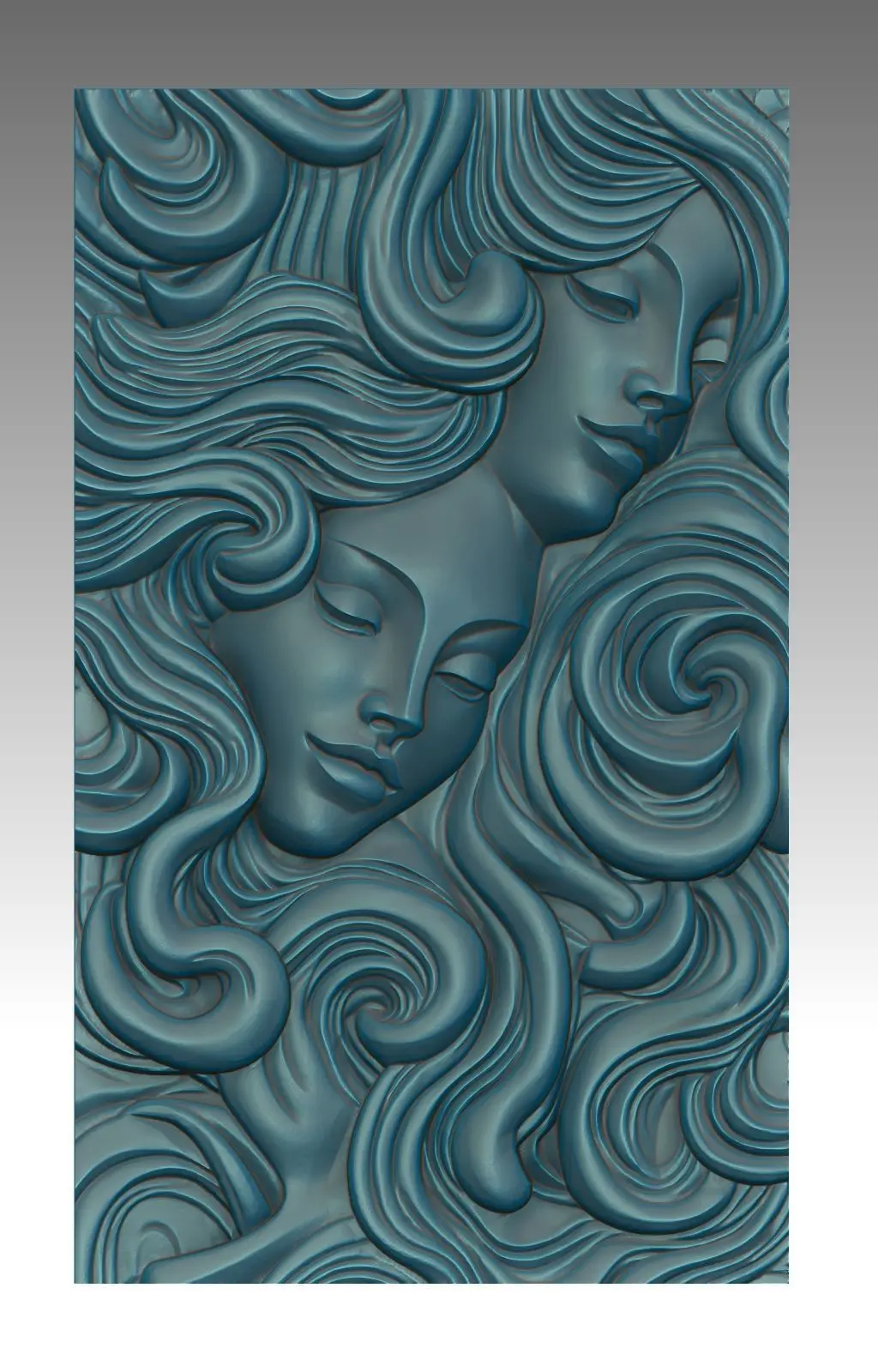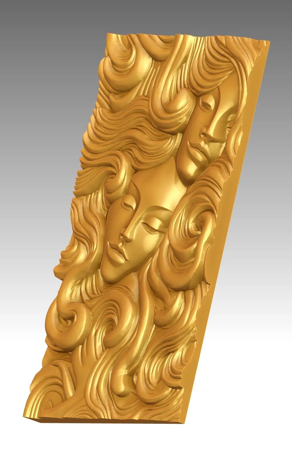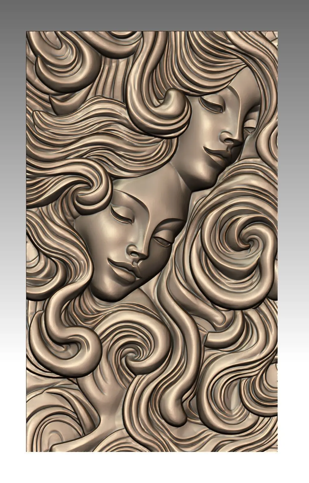 Serenity in Motion – Dual Goddess Marble Panel is a high-detail bas-relief sculpture design ideal for premium stone carving, wood carving, CNC machining, or 3D printing. This elegant panel features two ethereal female figures with serene expressions, their flowing hair and faces intertwined in a poetic composition that symbolizes peace, beauty, and divine femininity.