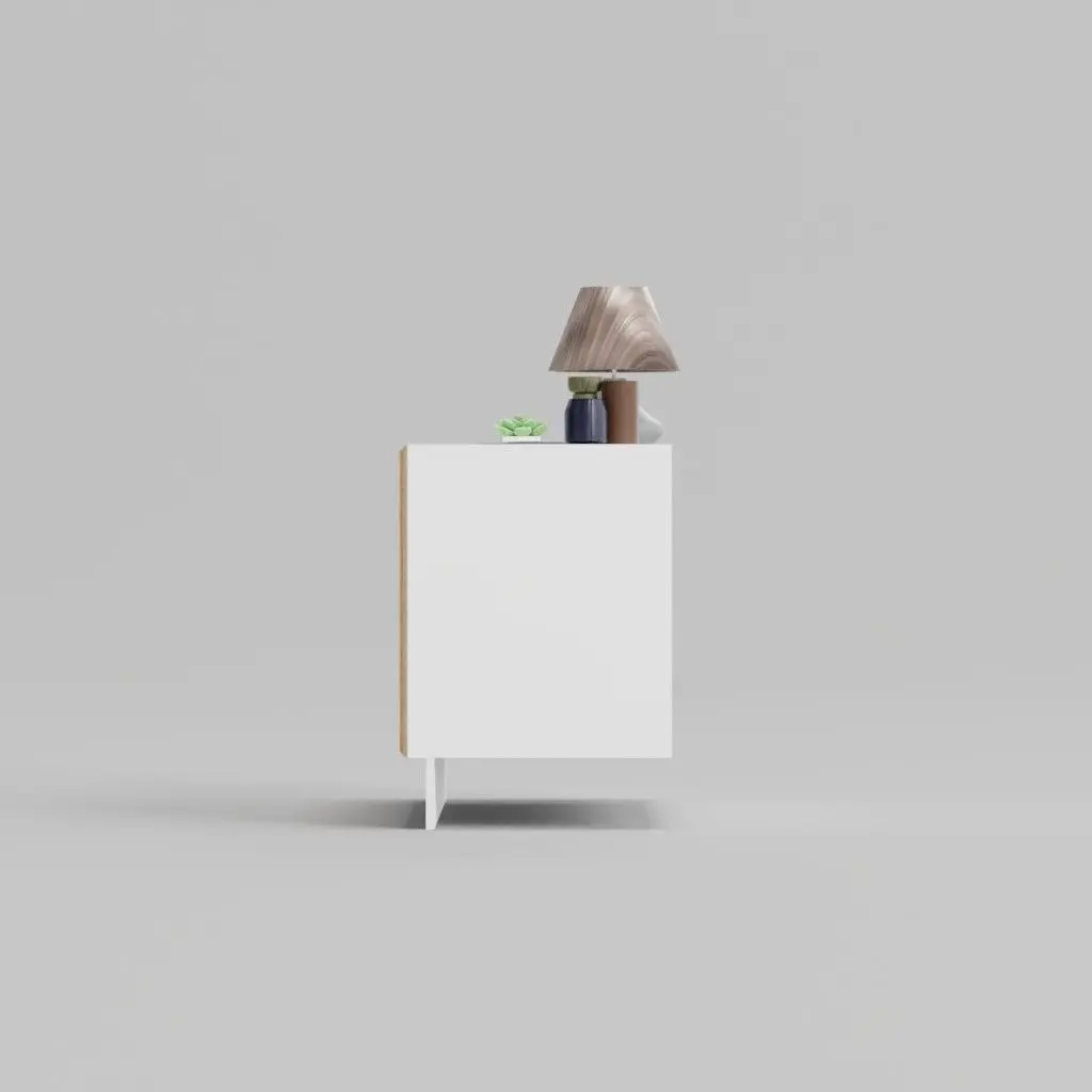 Design: The sideboard presents a sleek and contemporary design, with a harmonious blend of white and light wood finishes.Lamp: On the left, there’s a unique lamp with a metallic finish and an intriguing shape, adding a modern touch.Greenery: A small green plant in a white pot introduces a natural element and a splash of color.Vases: Two ceramic vases, one a taller green and the other a shorter blue, offer a decorative contrast and complement the sideboard’s color scheme.Surface: The sideboard’s surface is glossy, reflecting the items on it and enhancing the clean, minimalist aesthetic.This setup is a great example of contemporary interior design, where functionality meets style, and every item is carefully chosen to create a cohesive look.