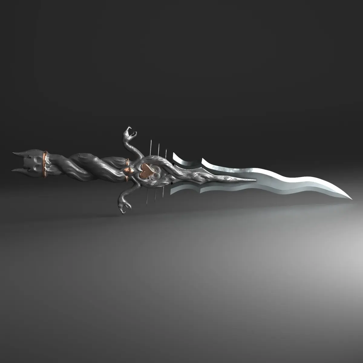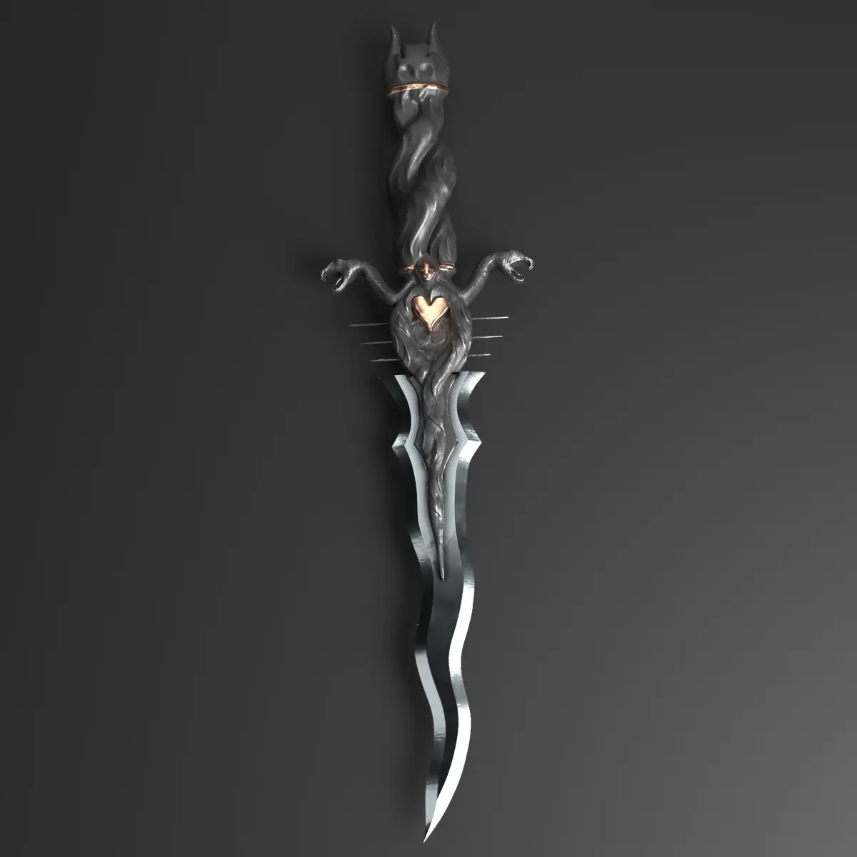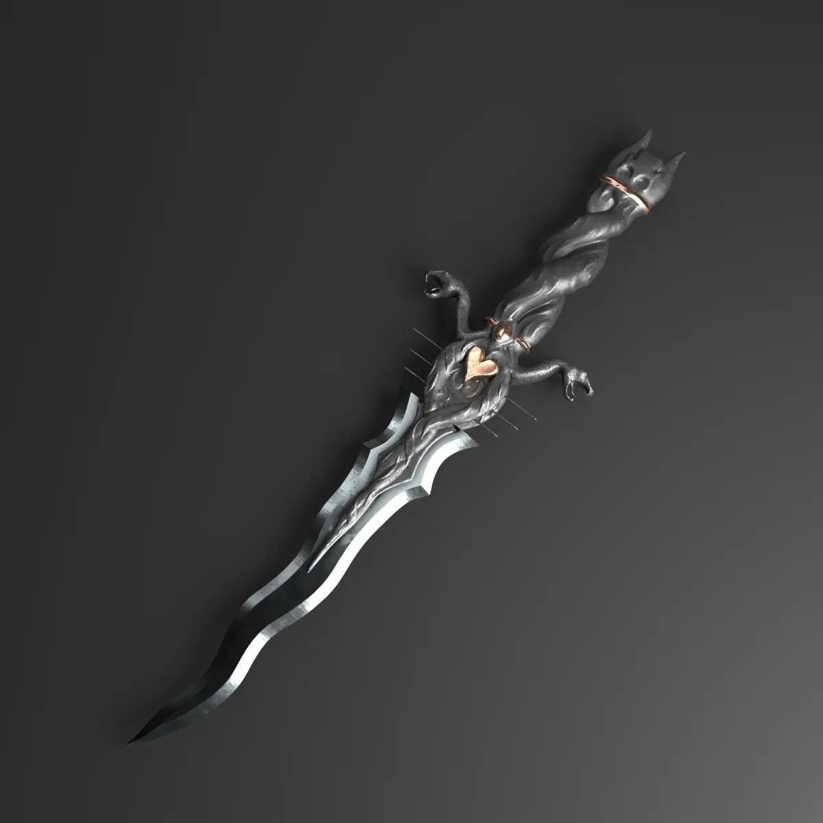 This low poly 3D model represents a fantasy Serpent dagger. The base model was created using 3ds Max software. Advanced versions of the model with high-poly details were sculpted in ZBrush. Additionally, the model has been textured using Substance Painter.