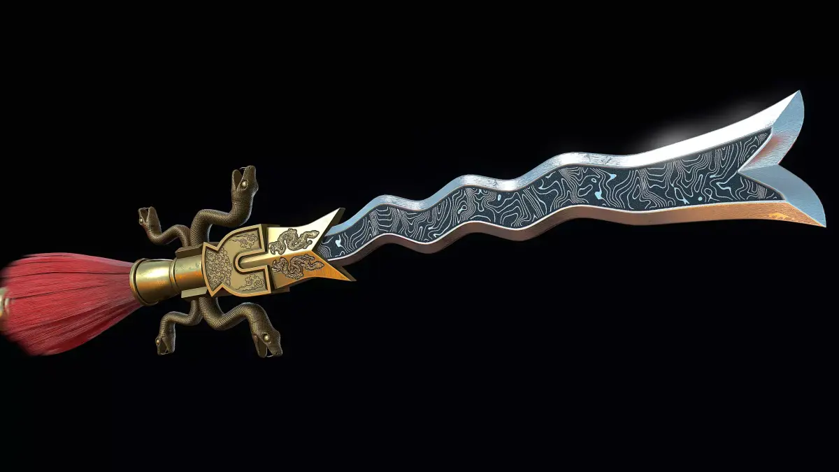 Low-poly model of serpent spear, doesn't contain any n-gons, has optimal topology. The archive has two folders with different texture sets, one for the tassel and another for the spear. All textures have 2k resolution and include such maps: base color, metalness, normal map (OpenGL), roughness, and opacity alpha for tassel. All videos and images were rendered in Marmoset.
