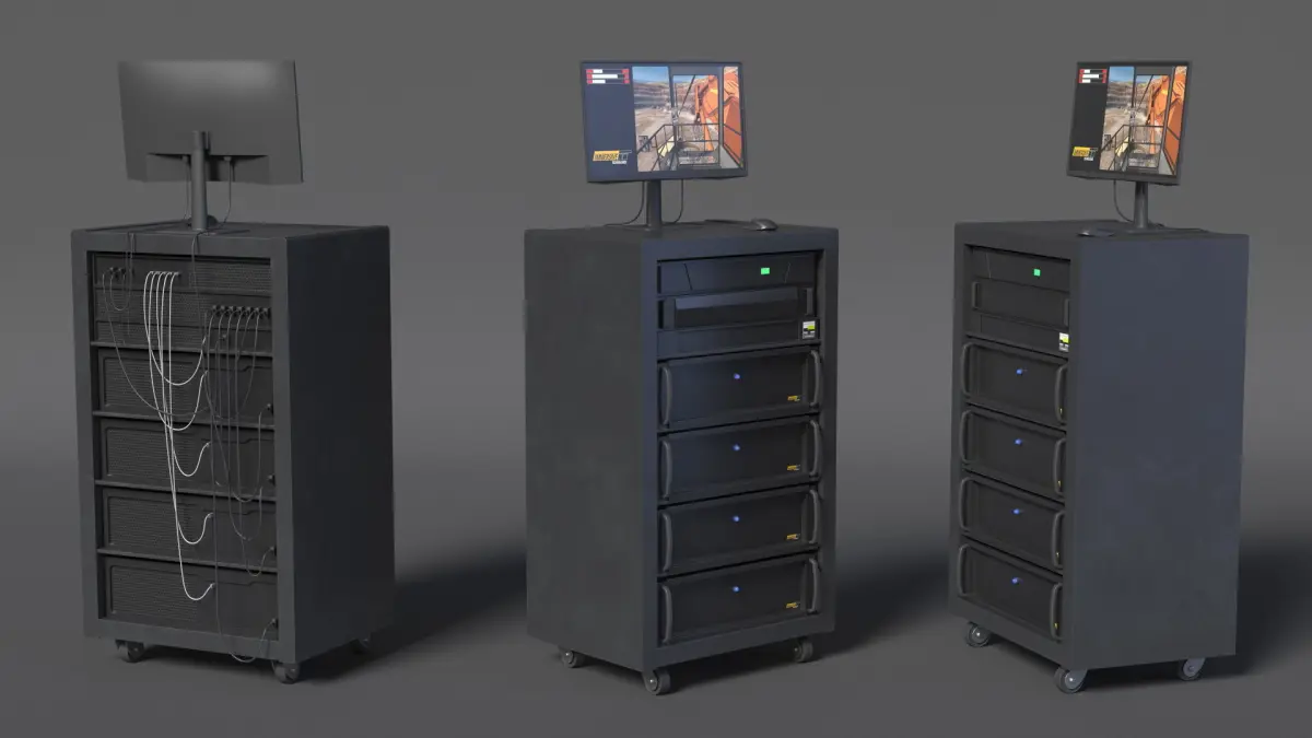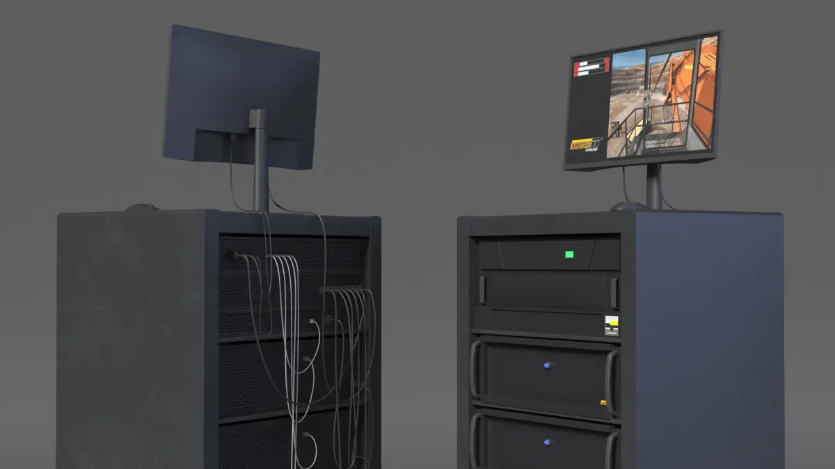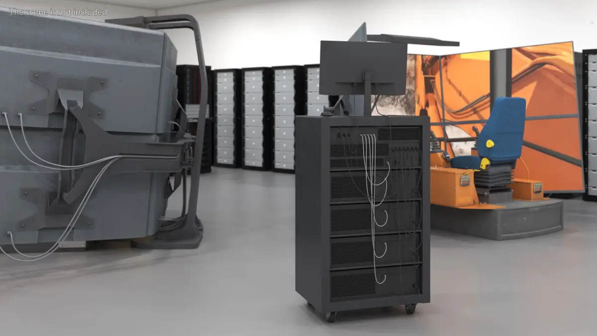 This model includes a tall server rack filled with organized server units, cooling systems, and wiring, accurately representing the hardware used in data centers or network operations. The model also features a connected desktop computer with a monitor mounted on the rack, used for overseeing system performance and diagnostics. The detailed design showcases cables, power supplies, and other essential components for a realistic tech environment.