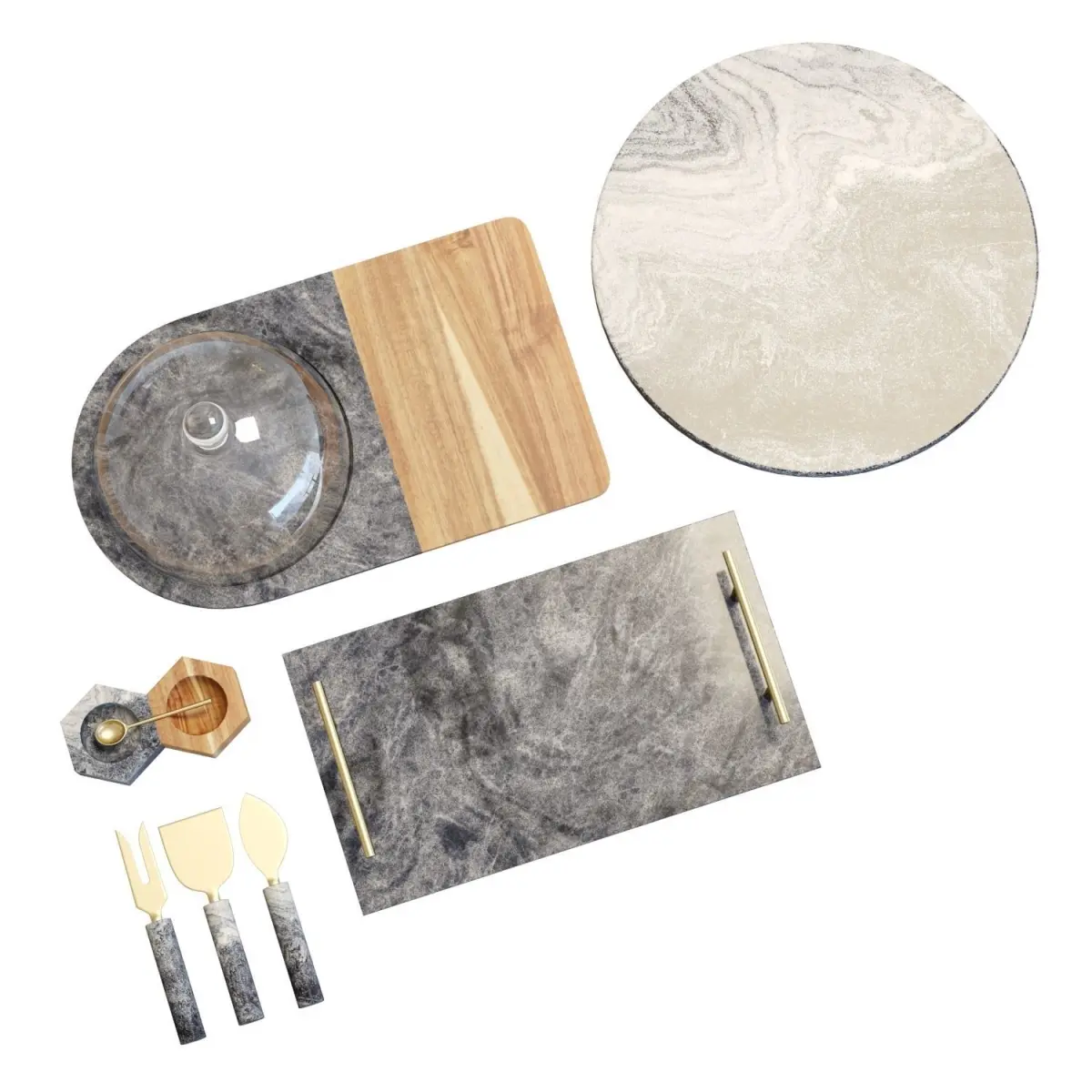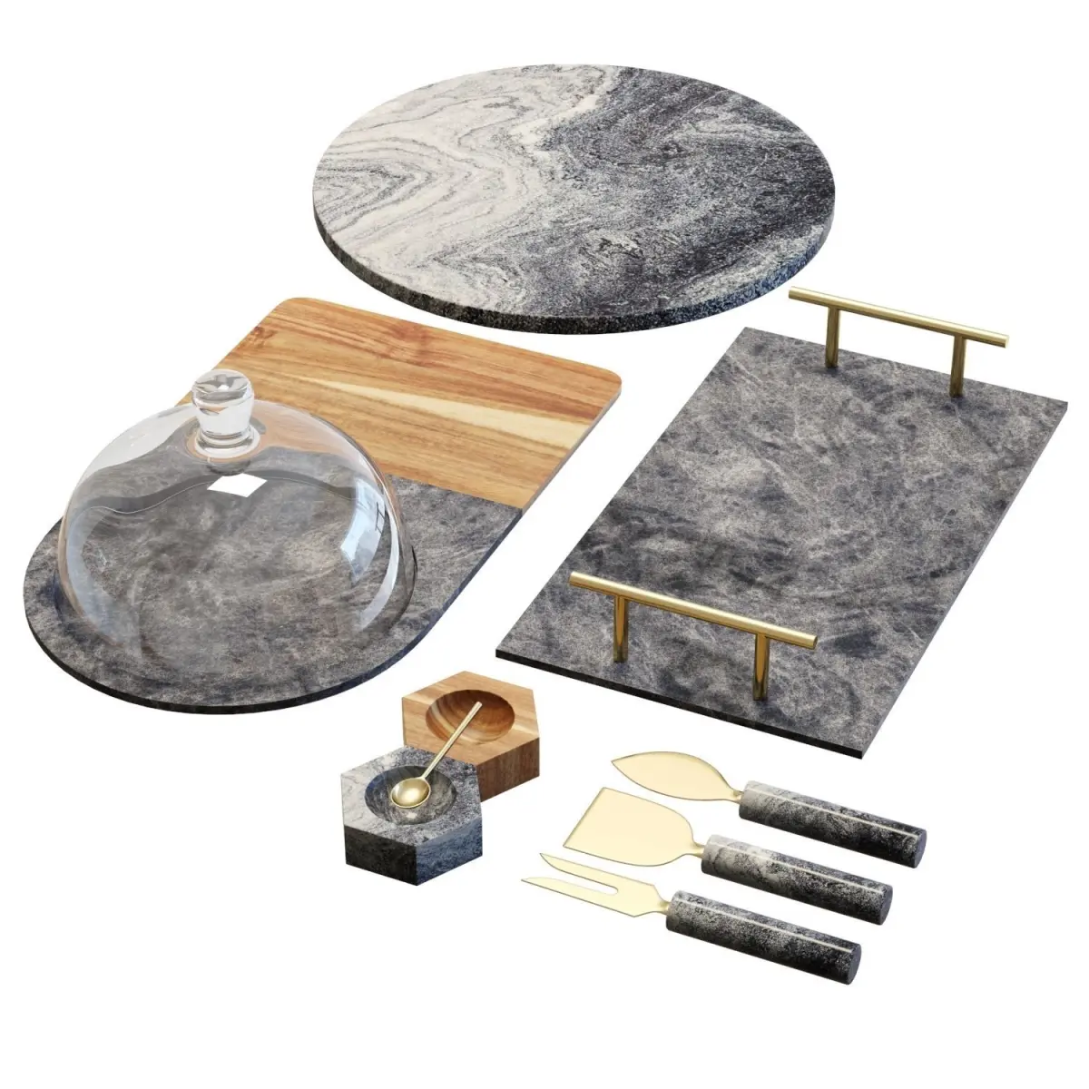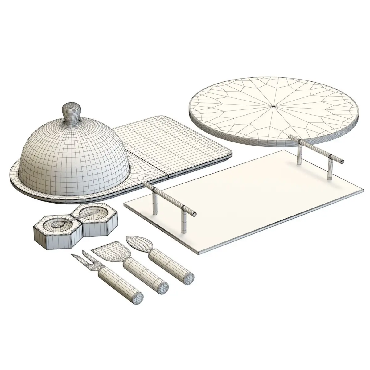 High-quality 3d model of a Crare and Barrel Hayes Serving Boards, Salt and Perret set, Cheese Fork and Knives.