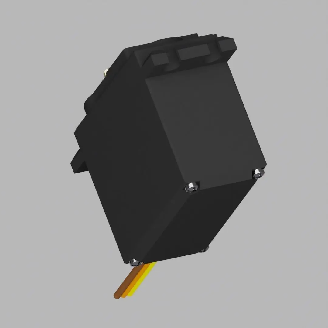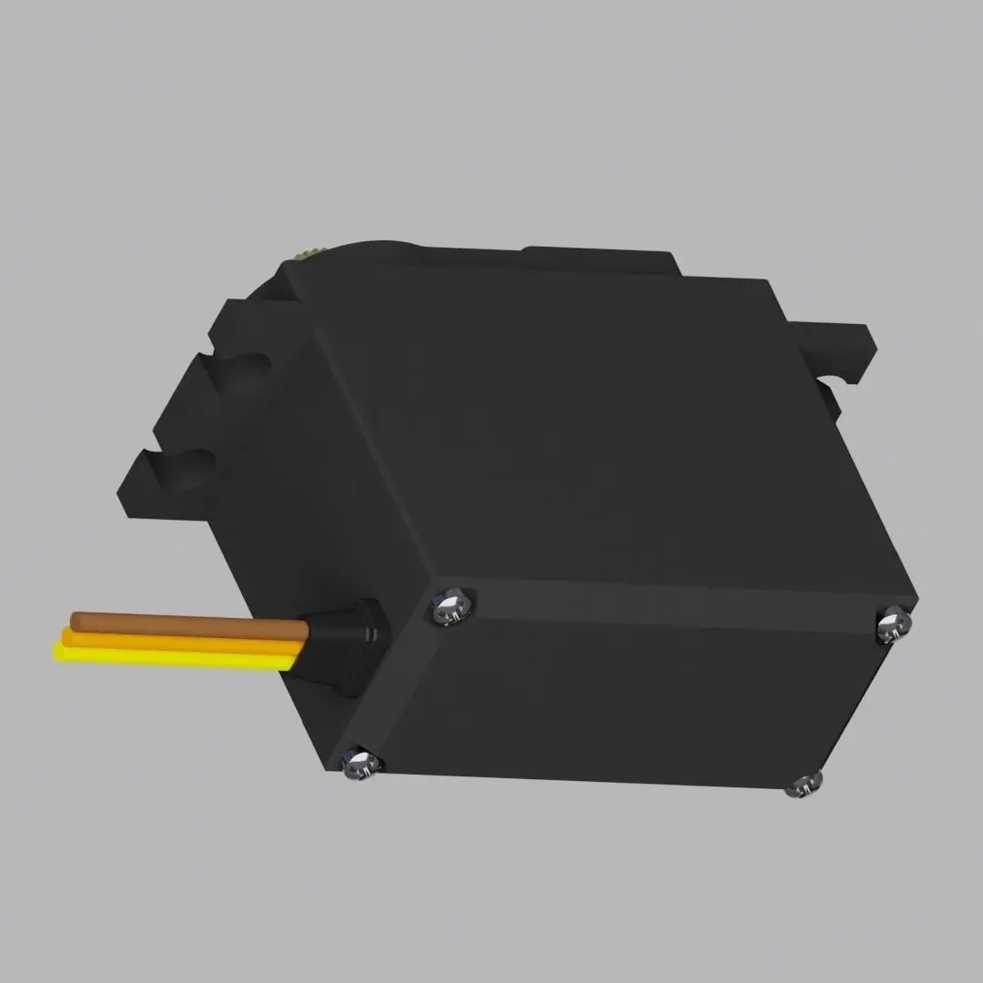 Detailed model of a small geared servomotor that may be used for RC vehicles, robotics projects, automation prjects, etc. The wire stress relief and wires are modeled separately and so can be included or not incuded. The 24 tooth spline is also modeled separately from the body so that it can be easily animated to rotate. All details are an accurate representation of the actual servomotor including the mounting holes, the 24 tooth spline and the M3 X 0.5 thread at the center of the spline.
