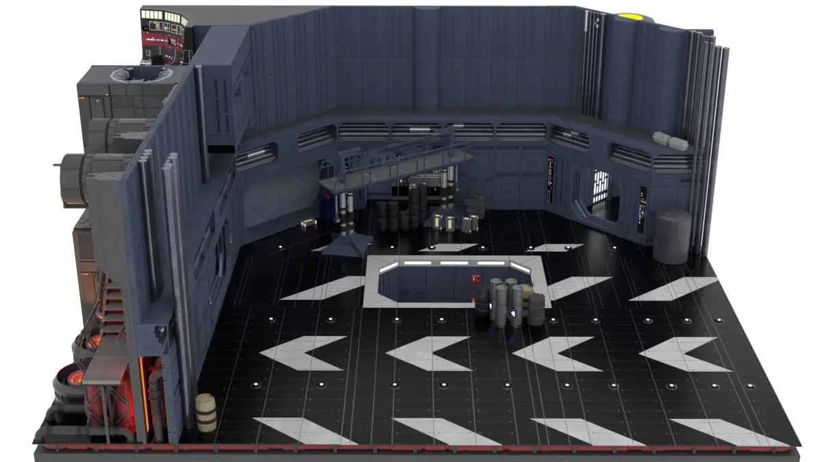 This set recreates the complete Docking Bay 2037, where The Millennium Falcon, is captures, and where Han, Luke, C3PO, R2D2, Chewy, and Leia try to escape from. This set is created to minimize the space and fit the Hasbro and Kenner Falcon. (compared to the movie this set is limited in space but does fit all the available Millennium Falcons)(1979 Original Kenner, 1983 re-release Kenner, 1995 Power of the Force Hasbro version, 2004 re-release Hasbro, 2008 Hasbro Legacy Collection BMF Big Millennium Falcon, 2018 Kessel Run version)