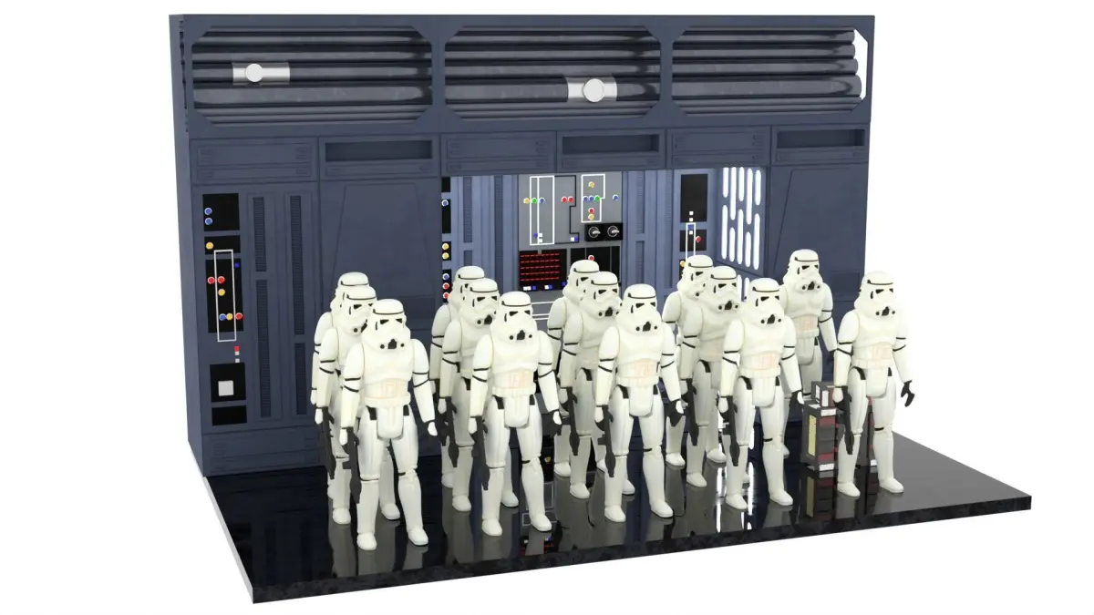 This very detailed little diorama is from the Star Wars Movie A New Hope when Luke, Han and Leia try to escape the Death Star Hangar. There are two alcoves (the other one is where C3PO and R2D2 are hiding till there friends return.). A nice little set that is easy to build.