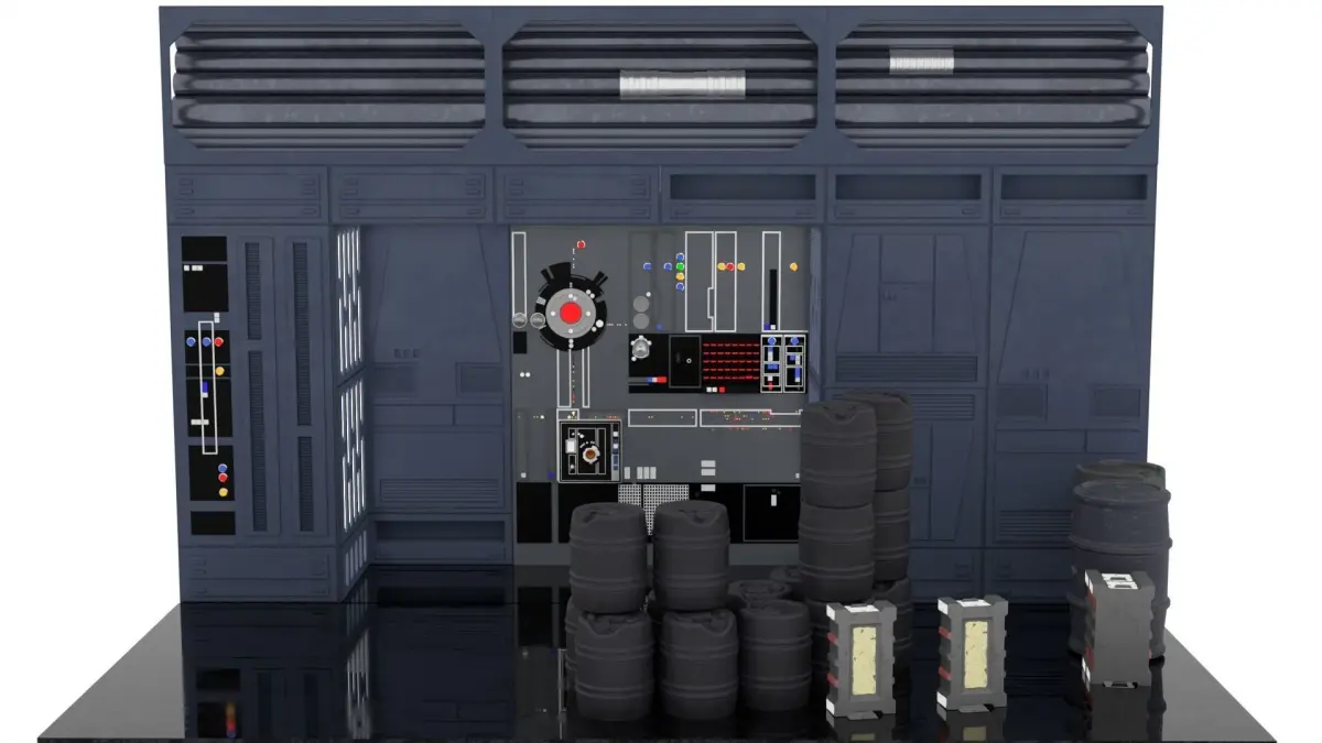 This very detailed little diorama is from the Star Wars Movie A New Hope when Luke, Han and Leia try to escape the Death Star Hangar. C3PO and R2 hide here and try to help there friends to escape. A nice little set that is easy to build.