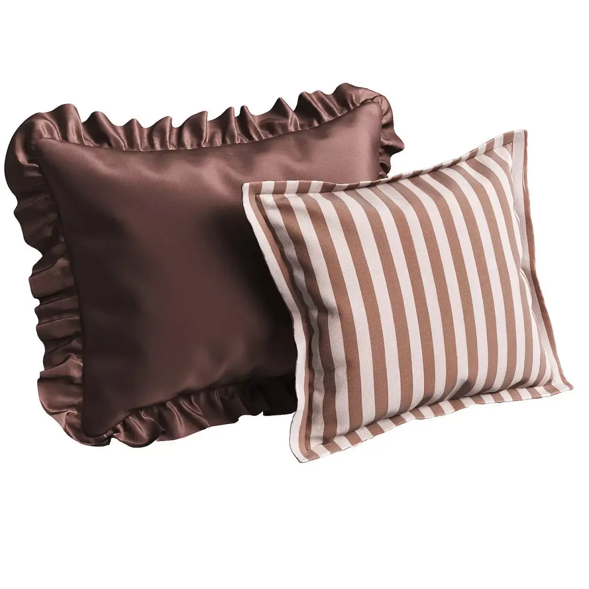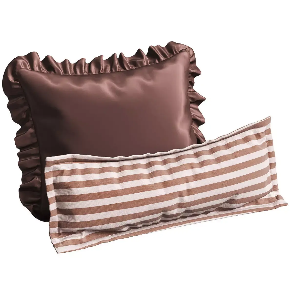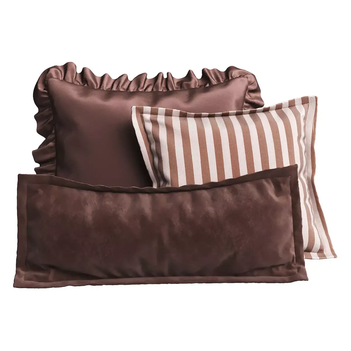 This decorative pillow set comes in chocolate brown and is available in silk, velour, and cotton. Suitable for beds, sofas, chairs, and more. The pillow features a ruffle, frill, flounce, and striped fabric, as well as a classic design.Dimensions 1: 72x48 cmDimensions 2: 54x42 cmDimensions 3: 74x28 cm