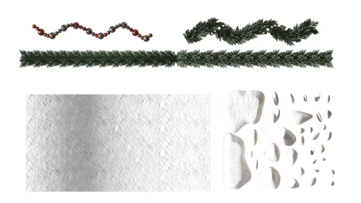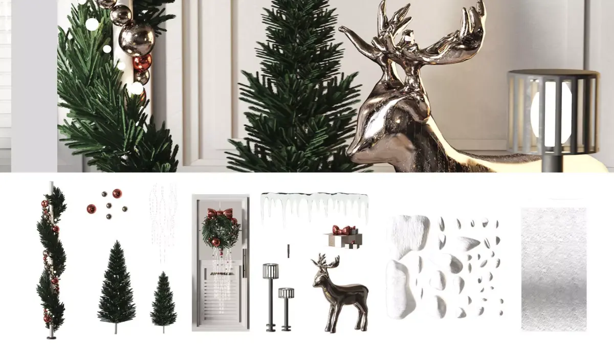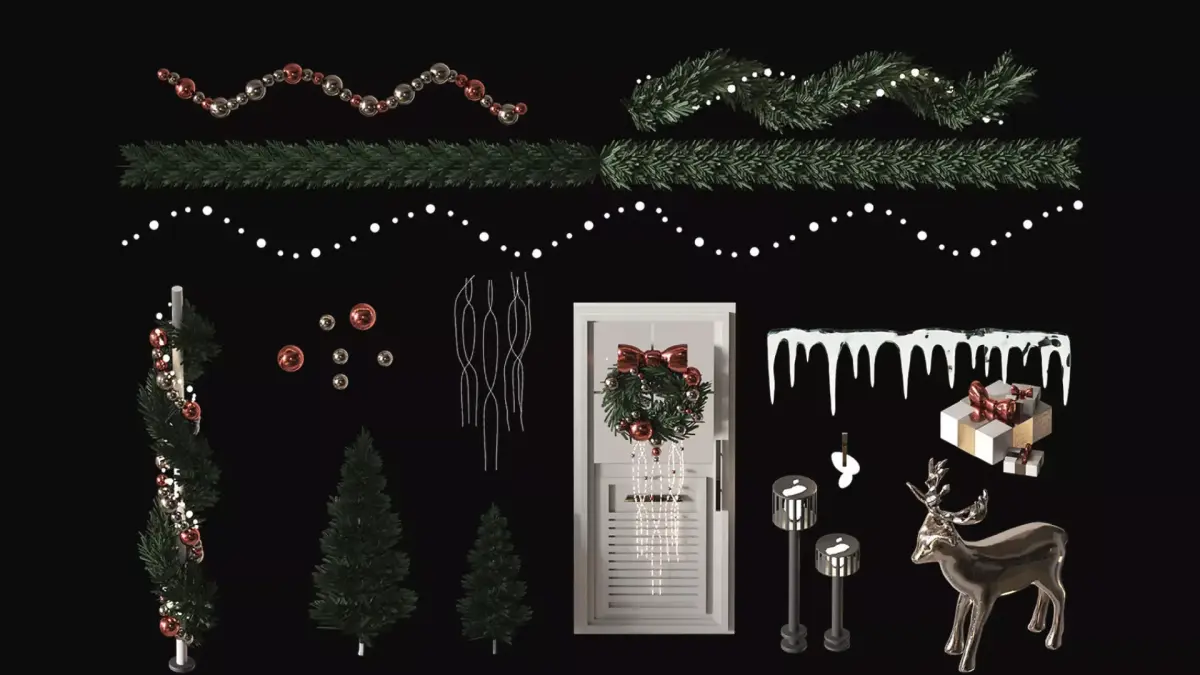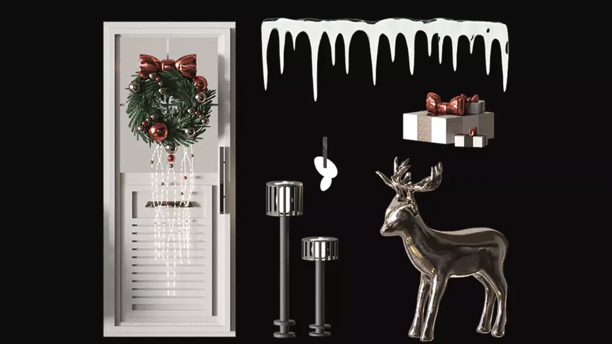 The set includes:christmas spiral garlands, spiral balls, luminous pendants, a pole with a garland , a large Christmas tree, a small Christmas tree, a New Year's door with a glass window, a street lamp, a wall lantern, a New Year's deer, icicles, gift boxes, snow material, snow stones, a Christmas wreath