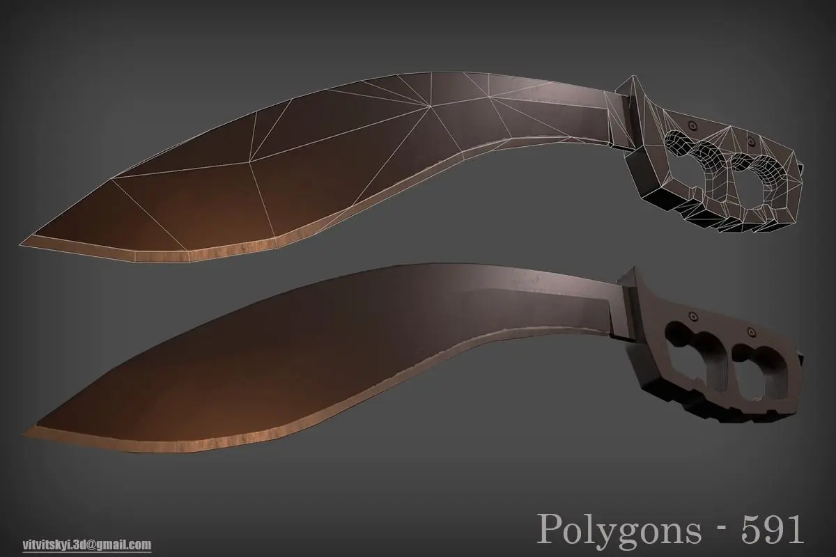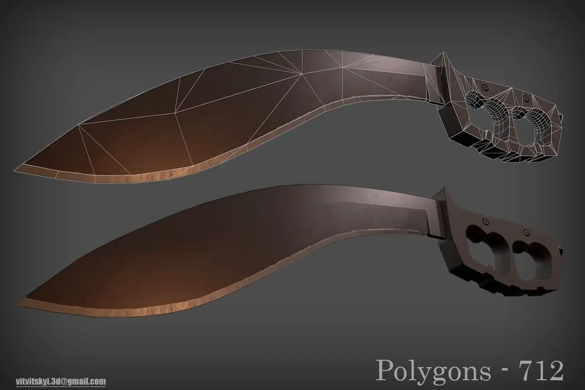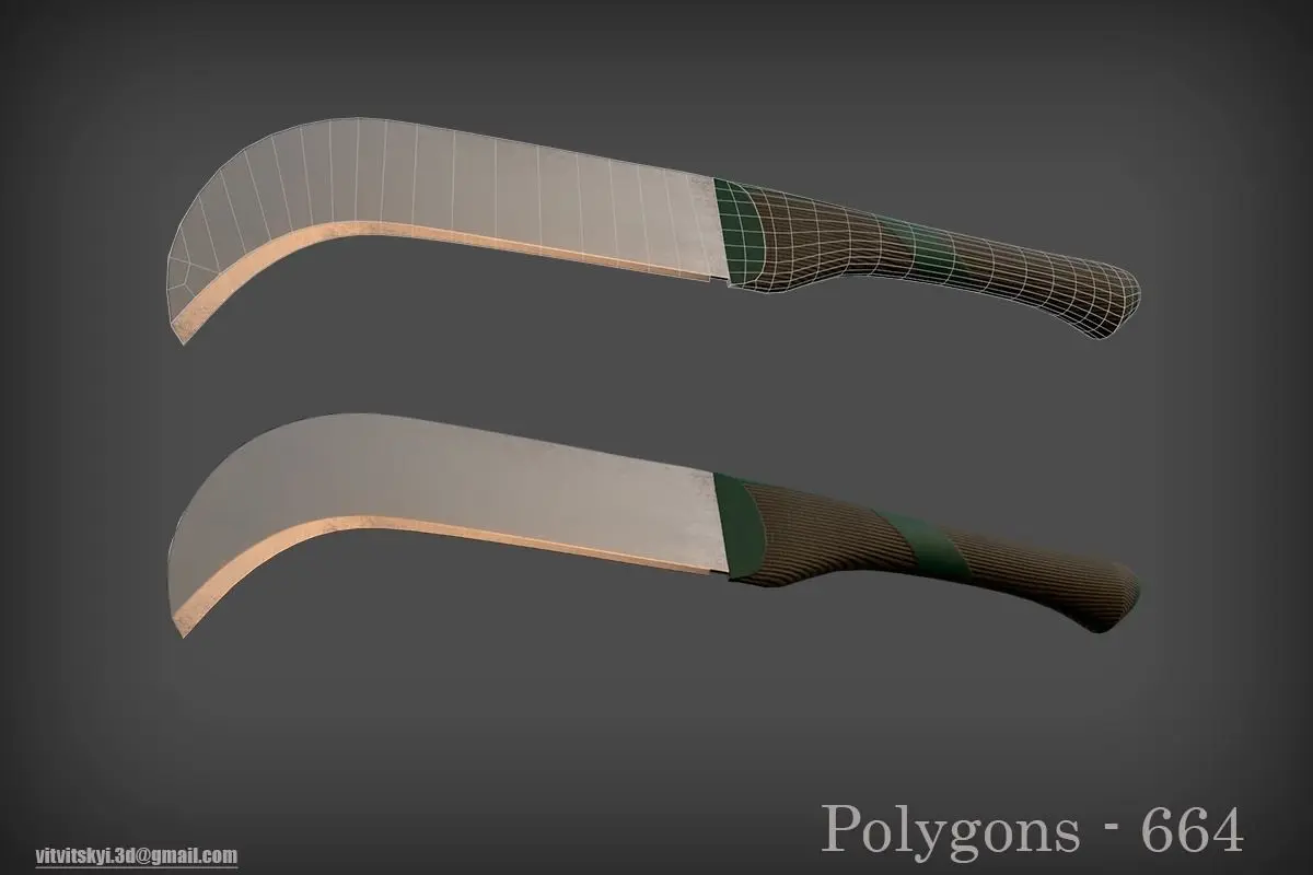Set of three kukri and machete knives. Textures in the format 512,1024,2048,4096Kukri in three versions:1) 901 polygons 837 verts2) 712 polygons 586 verts3) 591 polygons 471 vertsMachete number one in two versions:1) 1064 polygons 1031 verts2) 746 polygons 624 vertsMachete number two in one version:1) 664 polygons 665 verts