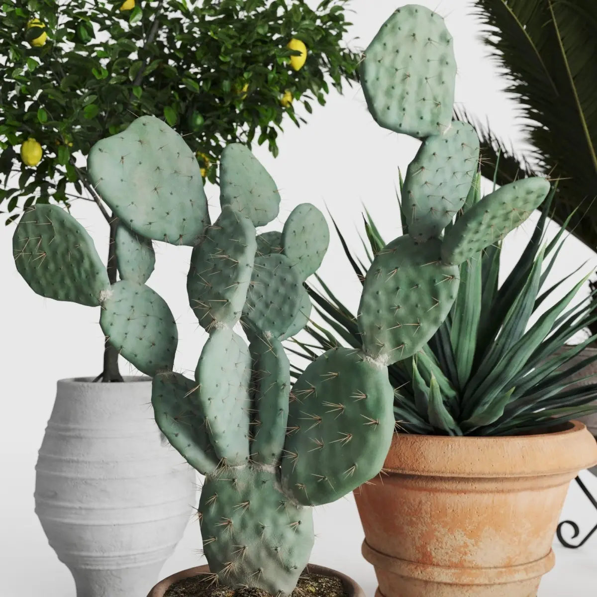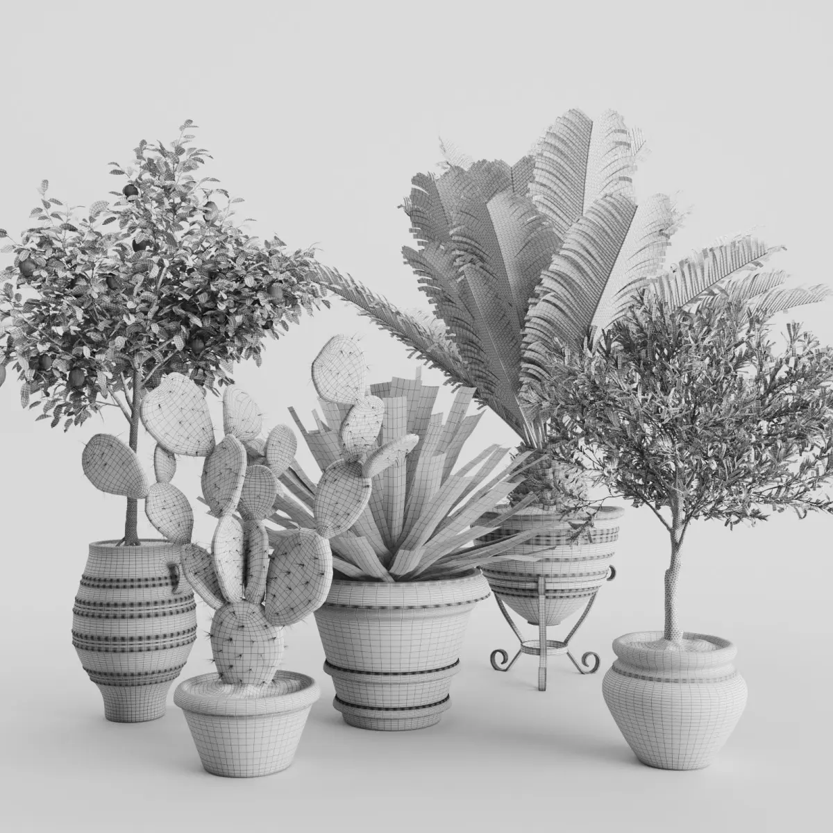 Set of five Mediterranean plants in antique clay pots.