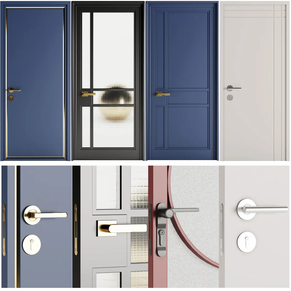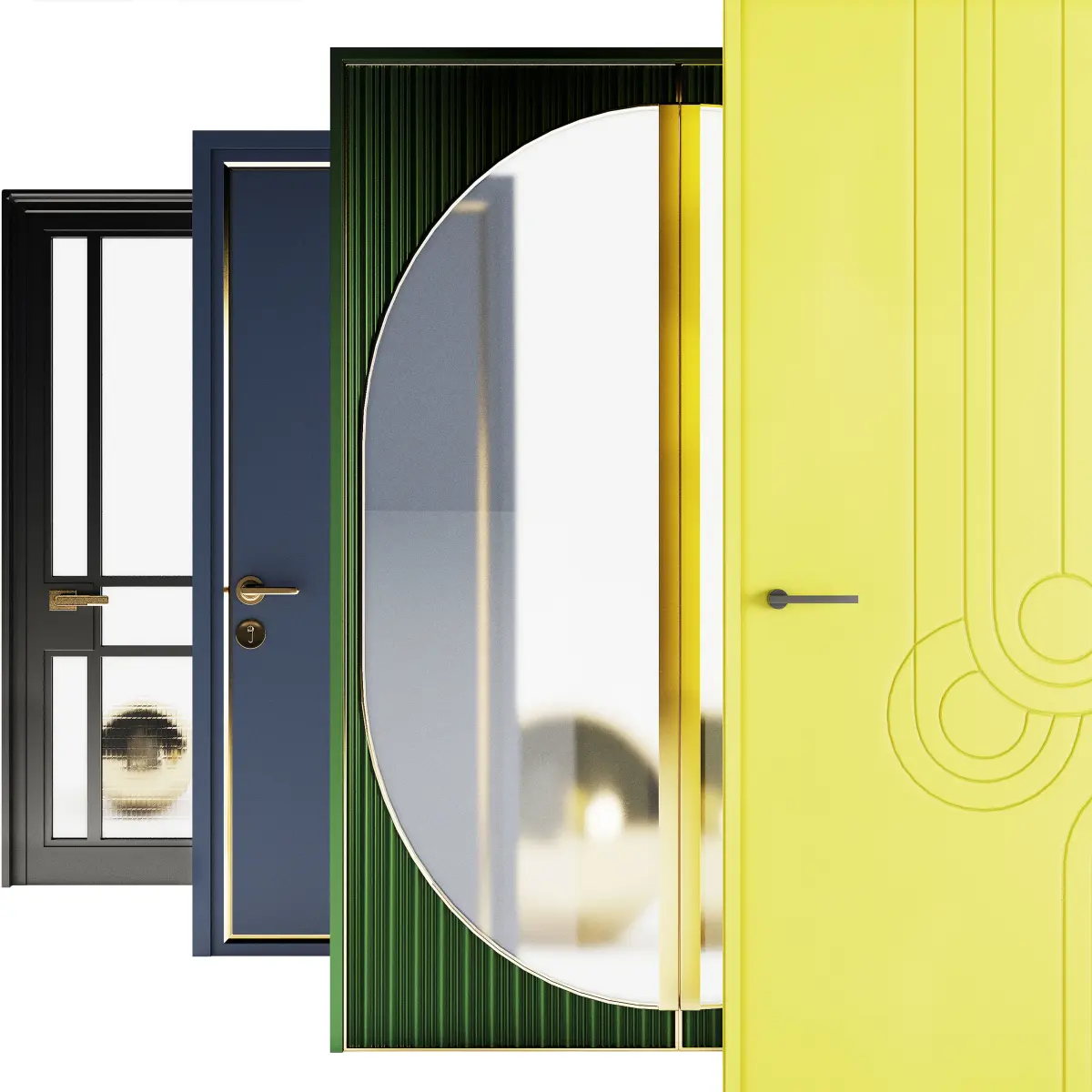Set of modern doors for interiors and exteriors. Different finishing materials can be used as the main entrance. The materials are based on physically correct parameters.