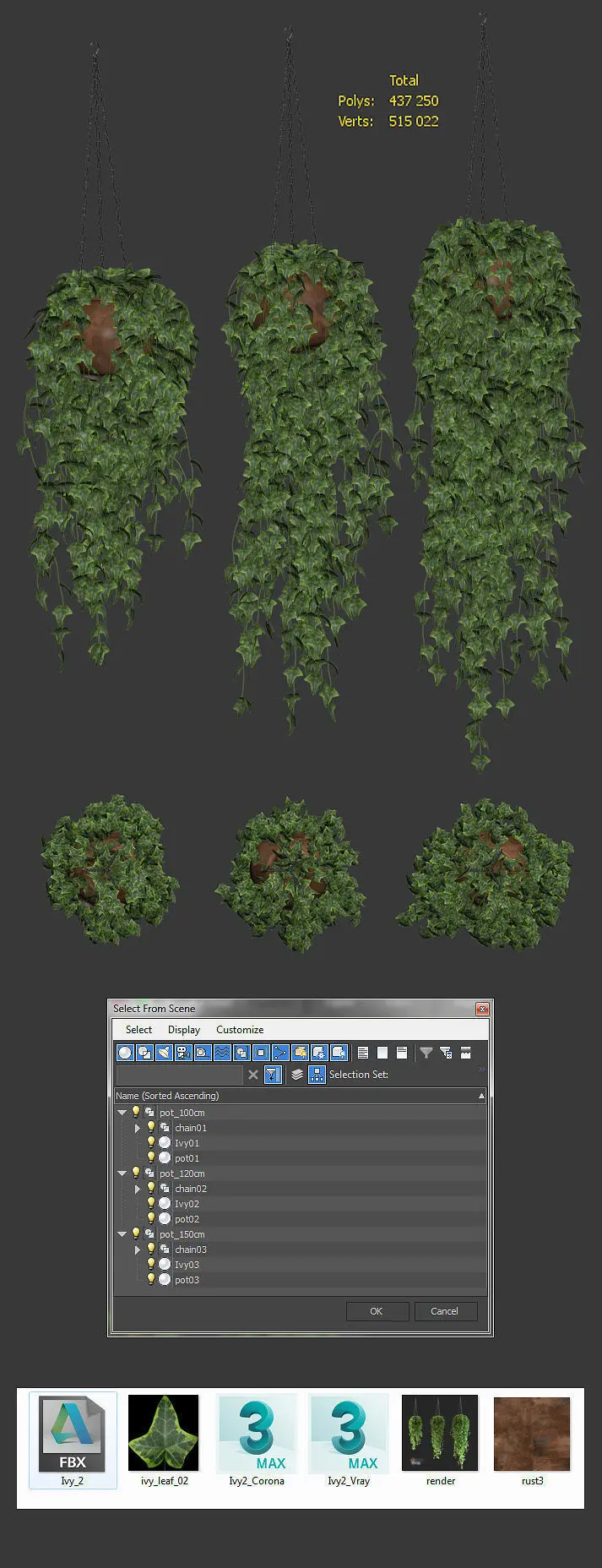 Ivy pot and chain are grouped. Everyone in a separate group. The origin of the model is on the hook for hanging convenience.