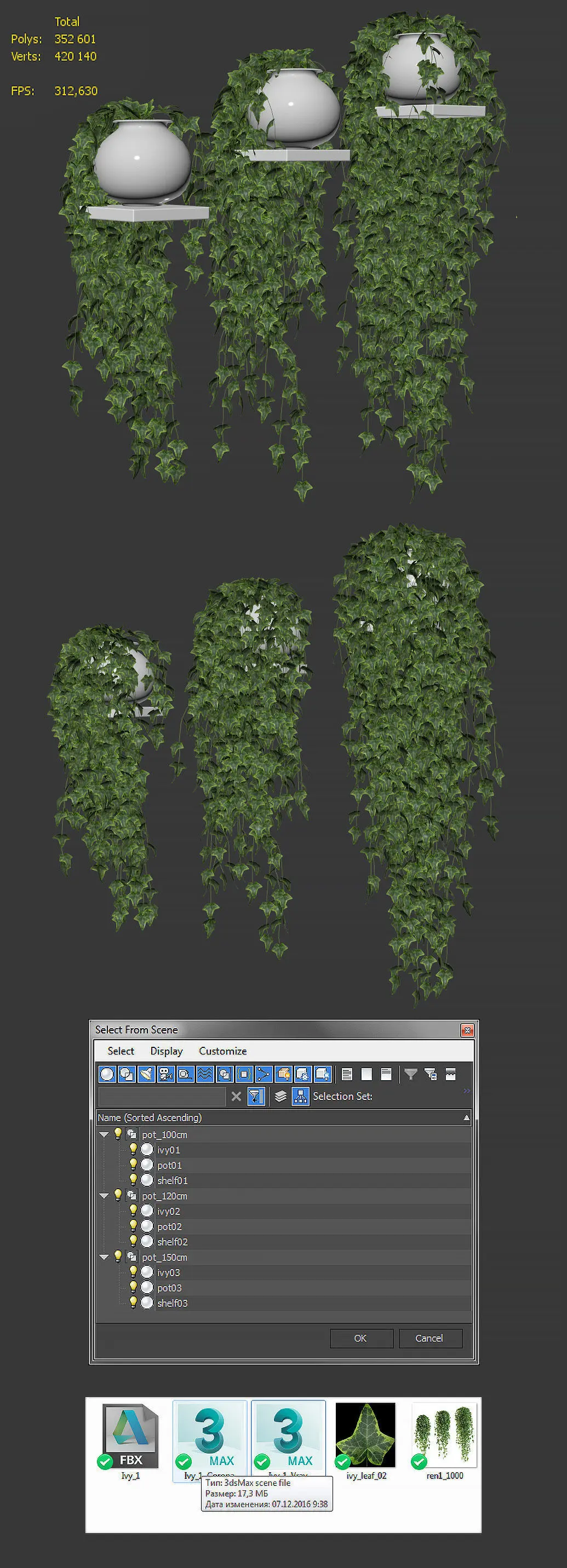 A set of 3 pots ivy models on the shelves