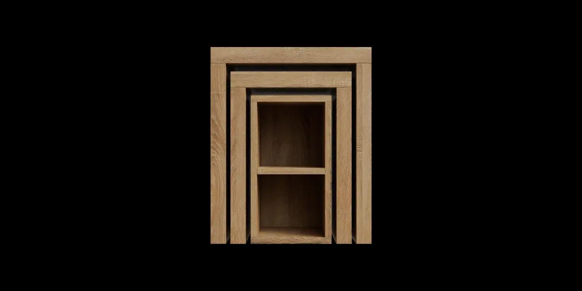 This model is a set of 3 rectangle oak sidetablesIt's suitable for decoration in your living room/bed room or some small cornersThe file consists of blend file format with 8k resolution baked textures:_ Base color_ Metalness_ Roughness_ Normal