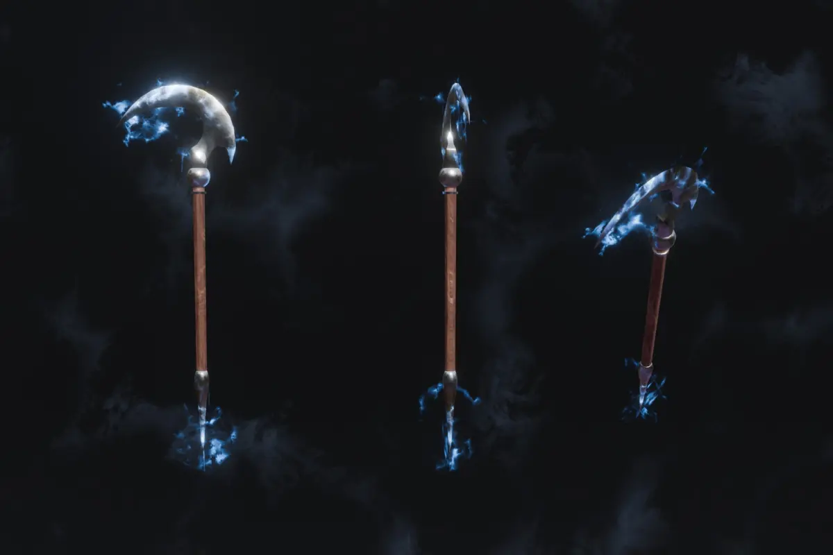 Embark on a journey with this stunning collection of 6 elemental Scythes.