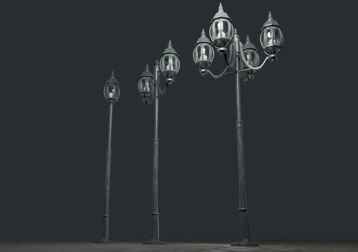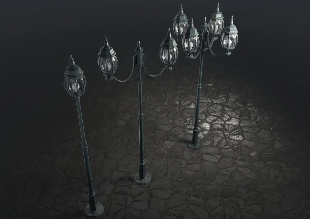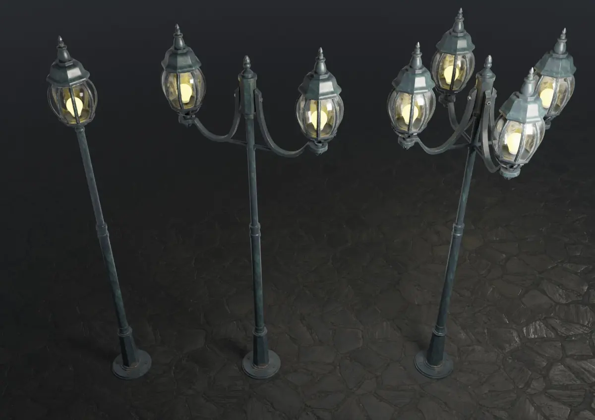 A set of three bounded street lamp models, for use in exterior visualizations. Each model has** one textures set 2048x2048, PBR Metal/Roughness**. Emmisive map included in textures, which allows you to adjust the lighting of the lamp. The models has one level subdivission, but can also be easily subdivided into higher levels.