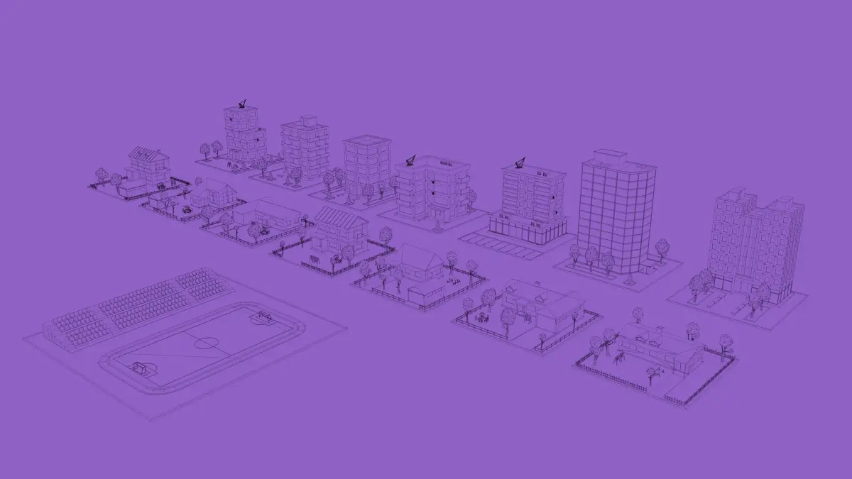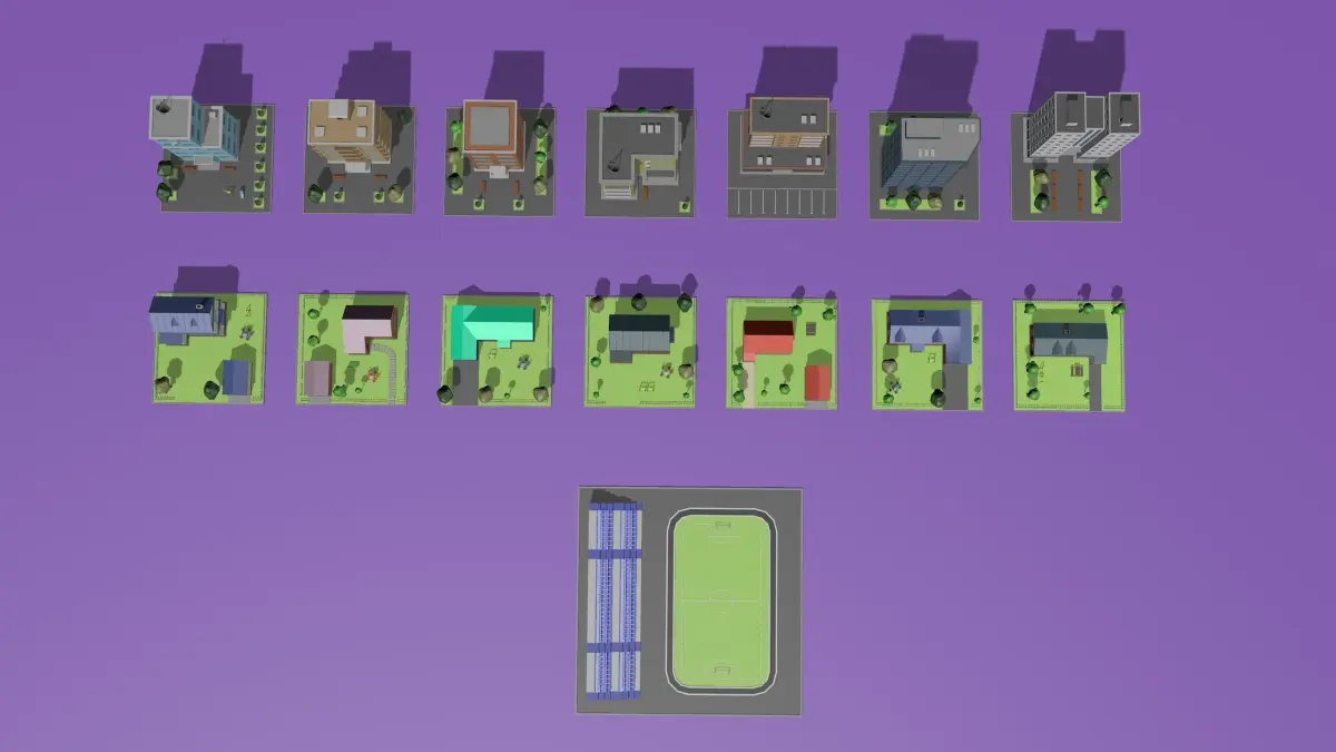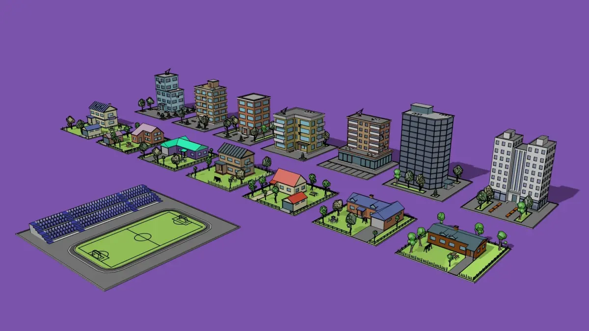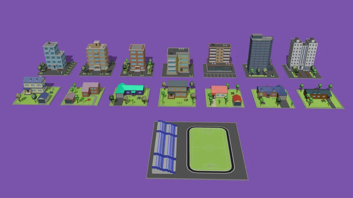 A set of low-poly models of country houses and multi-storey buildings plus a stadiumIncluded Format: