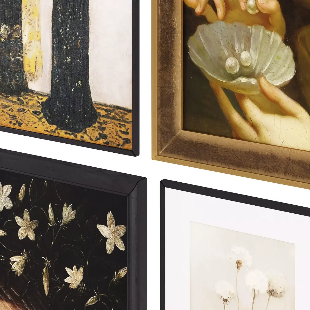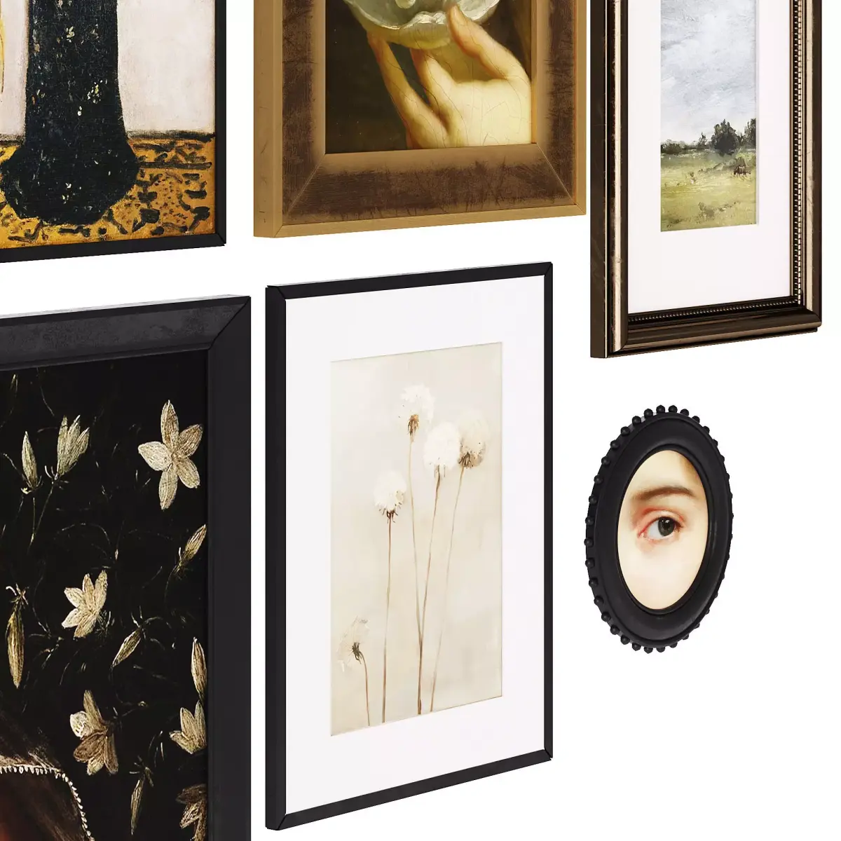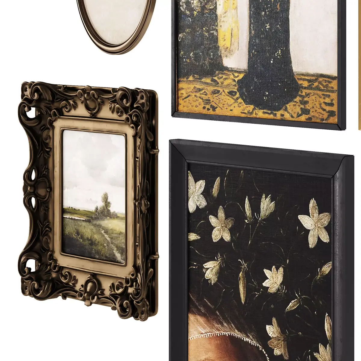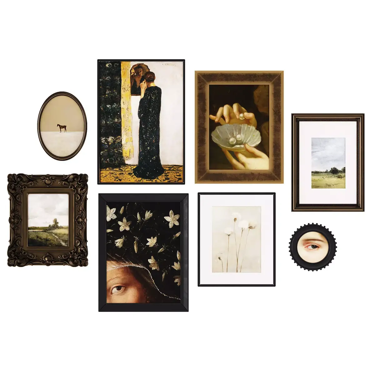 A set of classical paintings, oil with gold frames, cards with passe-partout, paintings in round frames.