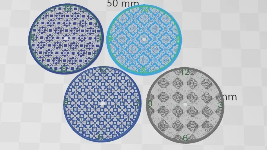 Set of four Delft Pattern Style Watch Dials for Enameling and casting. Interesting replicating patterns used in tile work, painting, and mosaic now brought to the enameling world. Havent cast any of these yet, i will update and add pics when i do. you really have to heavily sprue the back sides of them if you want something this thin to cast well. about 39mm by .8mm.