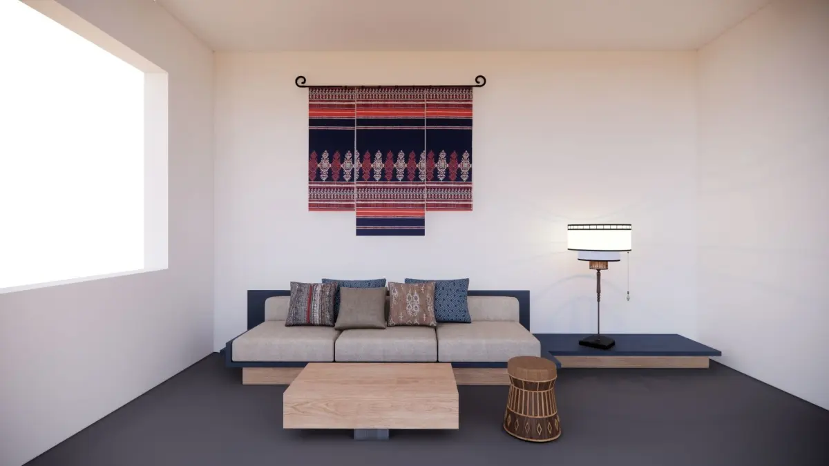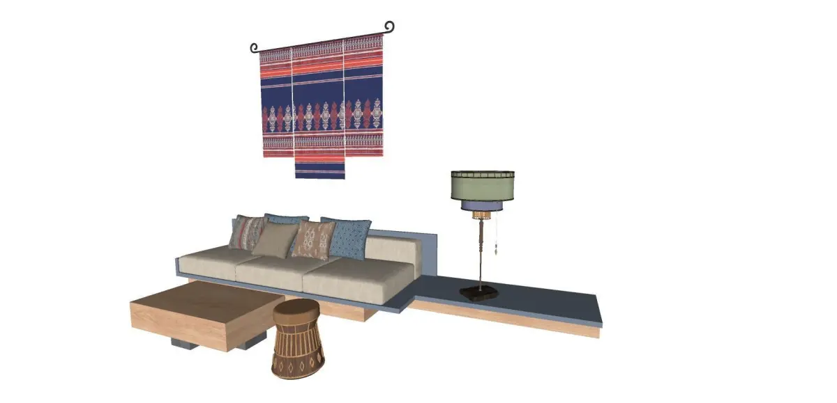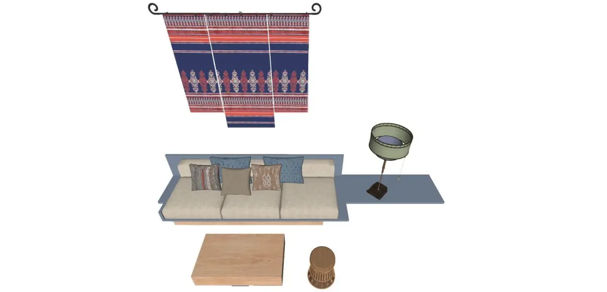 Set of furniture : lamp, sofa, table, pedestal, hanging curtains