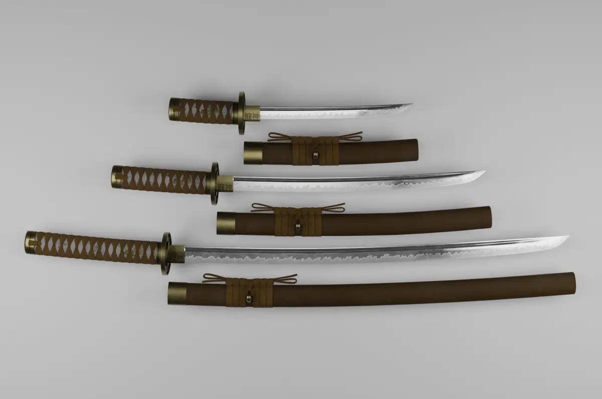 Set of japanese swords: Katana, Wakizashi, Tanto and Stand.