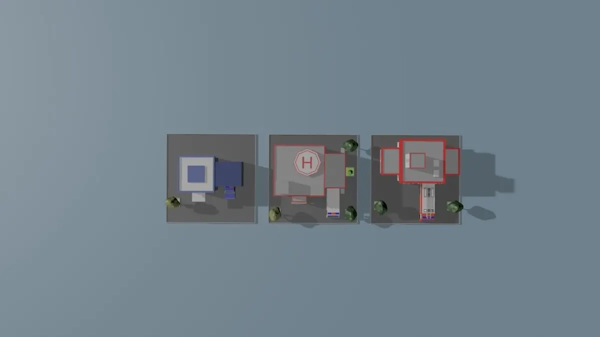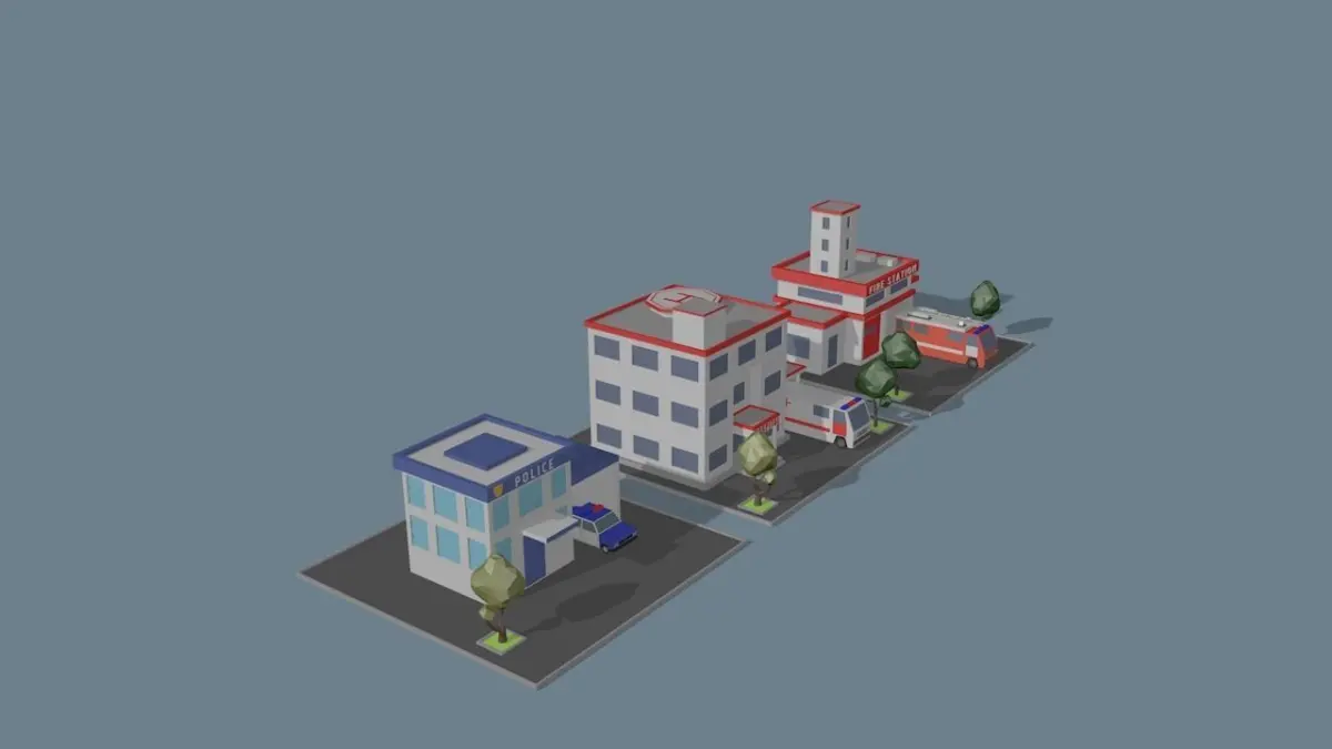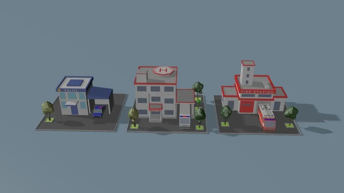 Low-poly 3D model of buildings of city services, fire station, police and hospital with carsFile Formats: