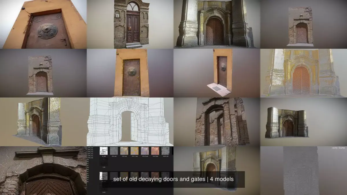 Scanned photorealistic old metal door - mongolian style Low-poly 3D modelDoor of VIlnius. This an actual door in Basanavičiaus street, Vilnius. This used to be (or still is) a restaurant by a name Čingishanas (Genghis Khan), so I guess it suppose to be Mongolian style. Suitable for any real time graphics - games, Augmented reality (AR) or virtual reality (VR). The wall is with open wires and cracks in plaster. Metal shield is depicted on a door. Good for run down cities. Textures are at 4k. Diffuse (color), Bump and normal map is included. (Only one side)Scanned photorealistic old ornamented door Low-poly 3D modelLow poly prop for VR / AR or flat screen game and any type of interactive application. Old wooden door in a brick house with dangling cable and a window above doors. Photogrammetry model with 4k textures that include diffuse, normal, bump and opacity maps. Manual retopology from scanned model. (Only one side) Old rusty church gate scan Low-poly 3D modelOld entrance gate to an old church. Photo-realistic 3D scanned model comes with 4k PBR textures and 3 LOD versions. Slow and a very fast door opening is animated in 3d max scene as well as in .fbx format. Door opens inwards much better. Other direction causes some intersections with a wall. Gate is decorated with symmetrical pattern made of wooden planks. Pictures of a gate where taken in a sunny day so light direction is baked in color map, but Photoshop was used to mitigate light directionality. Parts of gate that where barely seen from ground has less accurate textures. Manual retopology was performed on LOD 0, and automatic decimation was used for LOD 1 and 2. Level of detail as indicated by 3d s Max: lod 0 - 1939 polys, 3419 tris, 1812 verts. lod 1 - 1175p,t., 649v. lod 2 - 329p,t., 191v. The church was build in 1746–1768 in late baroque style. It was build as a Catholic church but in 1859 converted to Orthodox worship place then converted back to Catholic one. After second world war the church converted to a vegetable warehouse and two Concrete ceilings where constructed inside a Church. Now it is used for exhibitions and for Catholic ceremonies as well. Note that this is one sided thinn (no thickness) geometry. so if you plan for a camera to go in you will need to model the interior, and some thickness for door / gate. Old broken gate - door with relief decoration Low-poly 3D modelSmall entrance to a yard of residence building and a chapel. Broken bas-relief decorations surround the top of the gate. Some plaster still remains and some is no longer there so the bricks are exposed. Most of bricks are broken - some are newer, some are much older. The door is made out of small rustic wooden planks forming a nice diamond shaped pattern. Wooden parts are somewhat rotted and decayed. Model was scanned using photogrammetry therefore nice realistic textures are captured. PBR textures comes at 4k resolution. also includes bump map. LOD 0 has manual retopo at 5856 p. 3069 v. LOD 1 1436 p. 775 v. LOD 2 -370p. 215v. (as reported in 3d S max ) only fbx models are animated fast and slow dor opening. Note that this is one sided thinn (no thickness) geometry. so if you plan for a camera to go in you will need to model the interior, and some thickness for door / gate.