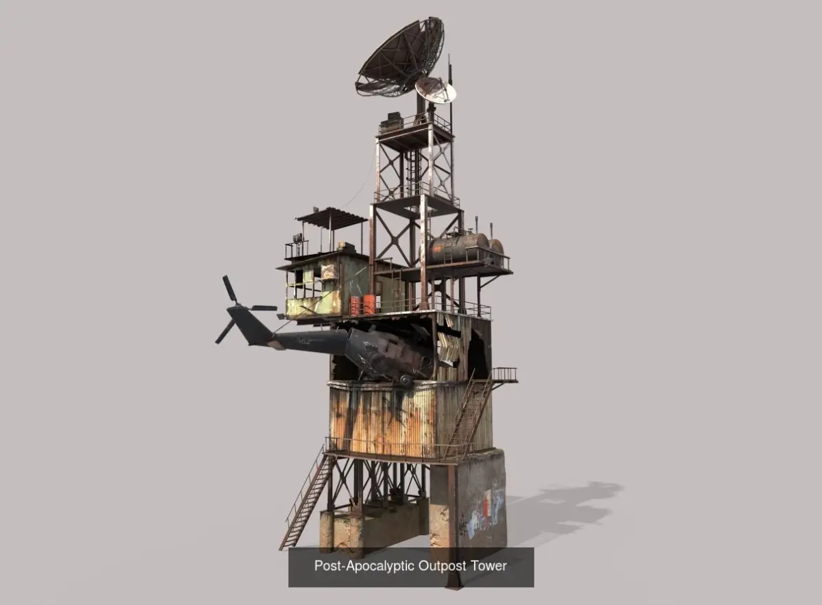 Models of Post-Apocalyptic Outpost Tower . Models are very realistic and PBR materials. Maps are diffuse-specular-glossiness-height and normal. Model's textures has two sizes; 4096x4096-2048x2048. All maps are JPEG and PNG formats. Record formats: MAX -OBJ- 3DS -FBX