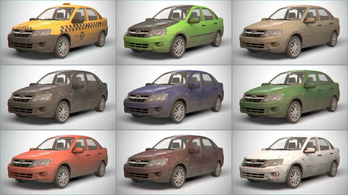 All texture sets comes in two variations: clean and rusty.Also added some color variations for body material.Materials: