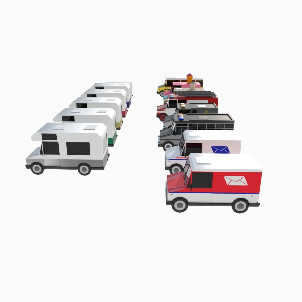 Set of low poly vans special equipment. The set is ready to be introduced into the game. A set of special equipment for low-poly vans. The set is ready to be introduced into the game. It includes 10 unique items and 14 modifications and color variations. Each model has from 1700 to 3000 polygons. The entire set consists of 28034 polygons. Models were made in Cinema 4D 2023, converted to 3DS Max, Blender, Unity, Unreal Engine and other formats. PBR texture palette – png 4K, 2K and 1K.