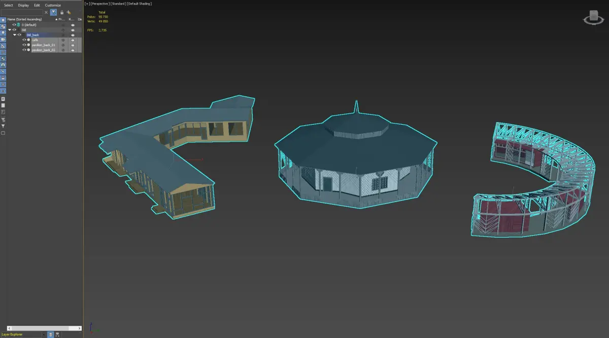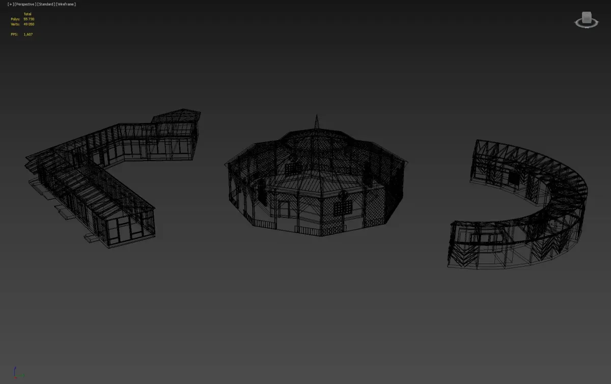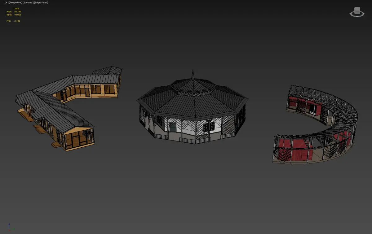 This set includes three distinct architectural 3D models: a wooden pavilion, an octagonal market stall, and a lightweight open-air structure. Perfect for parks, fairs, or outdoor commercial visualizations.