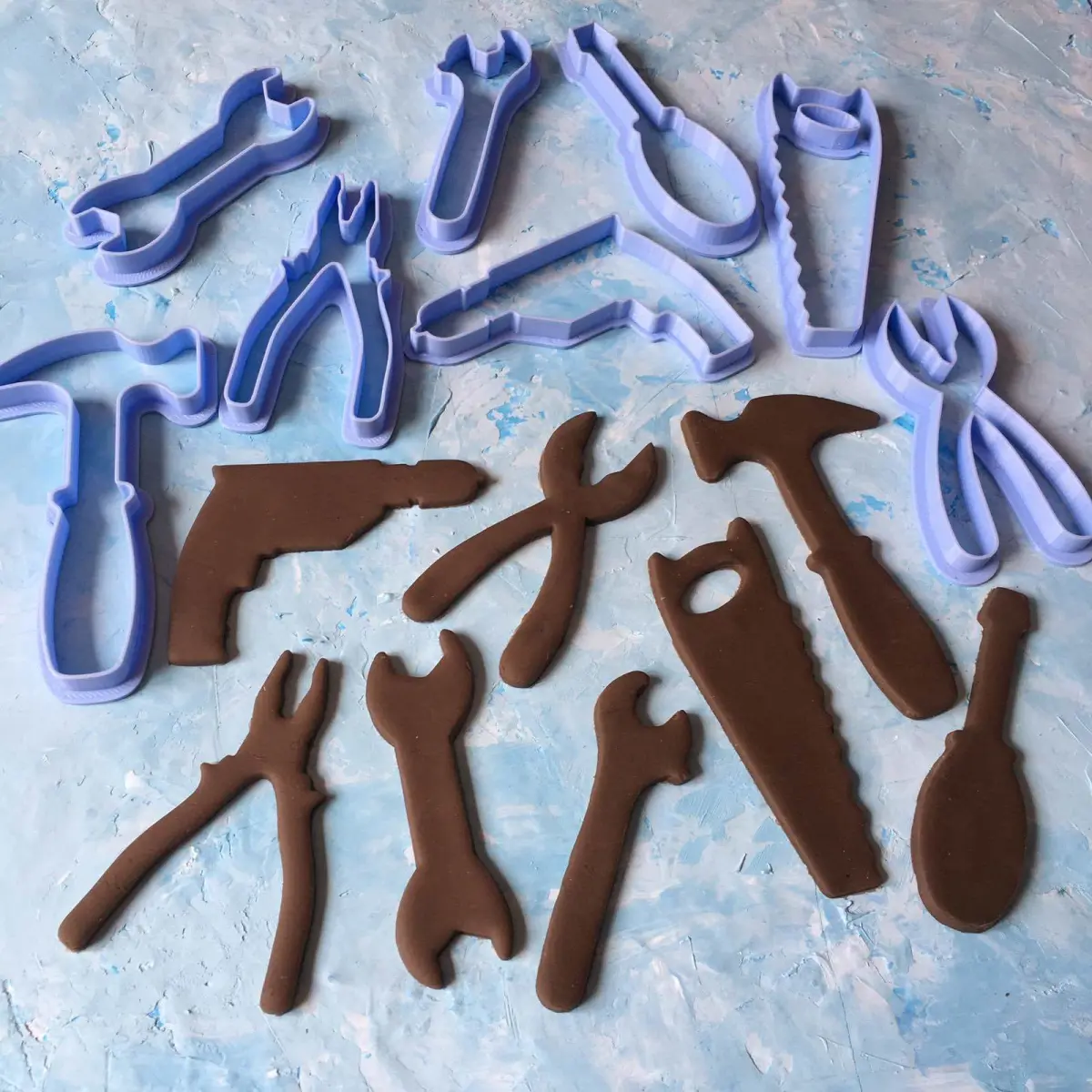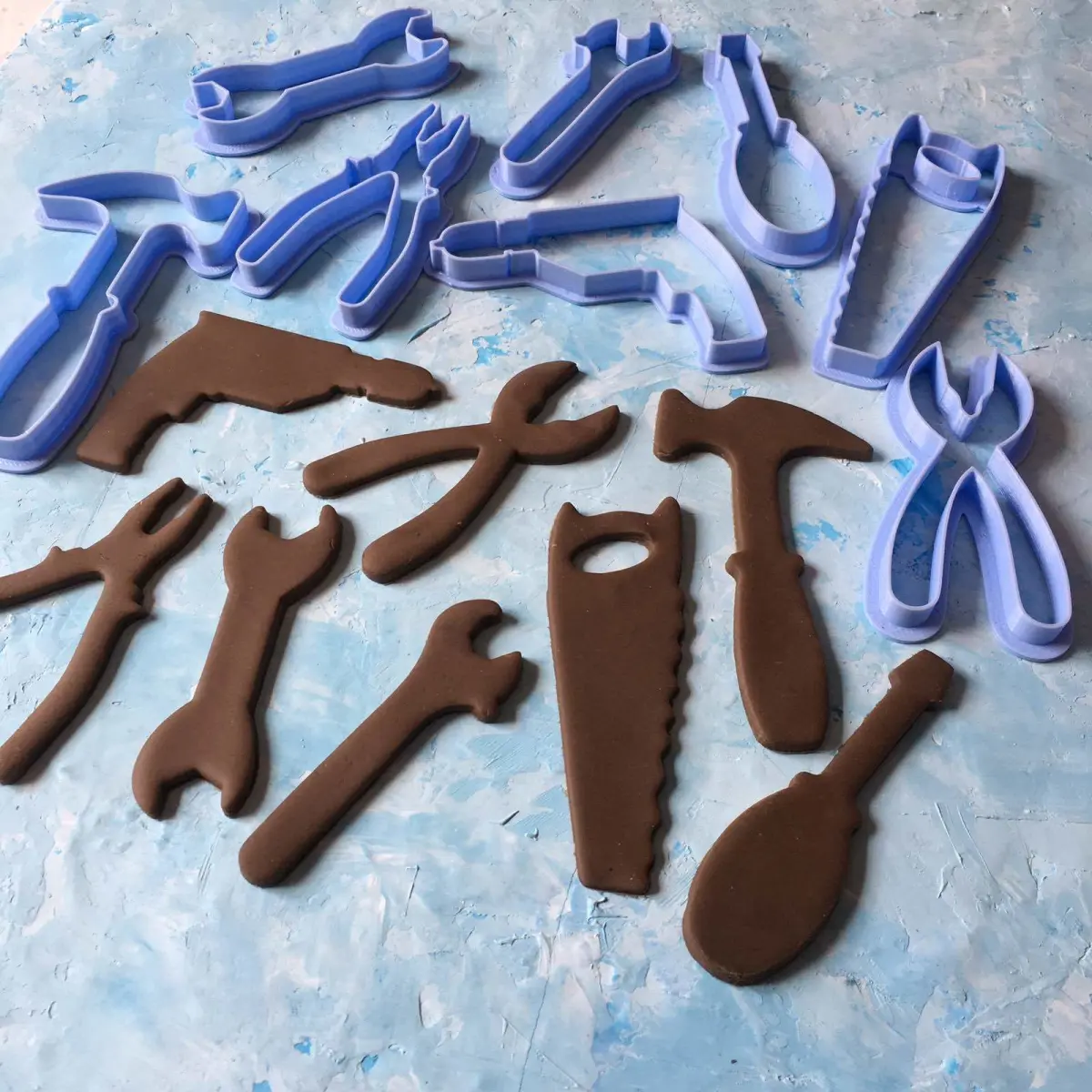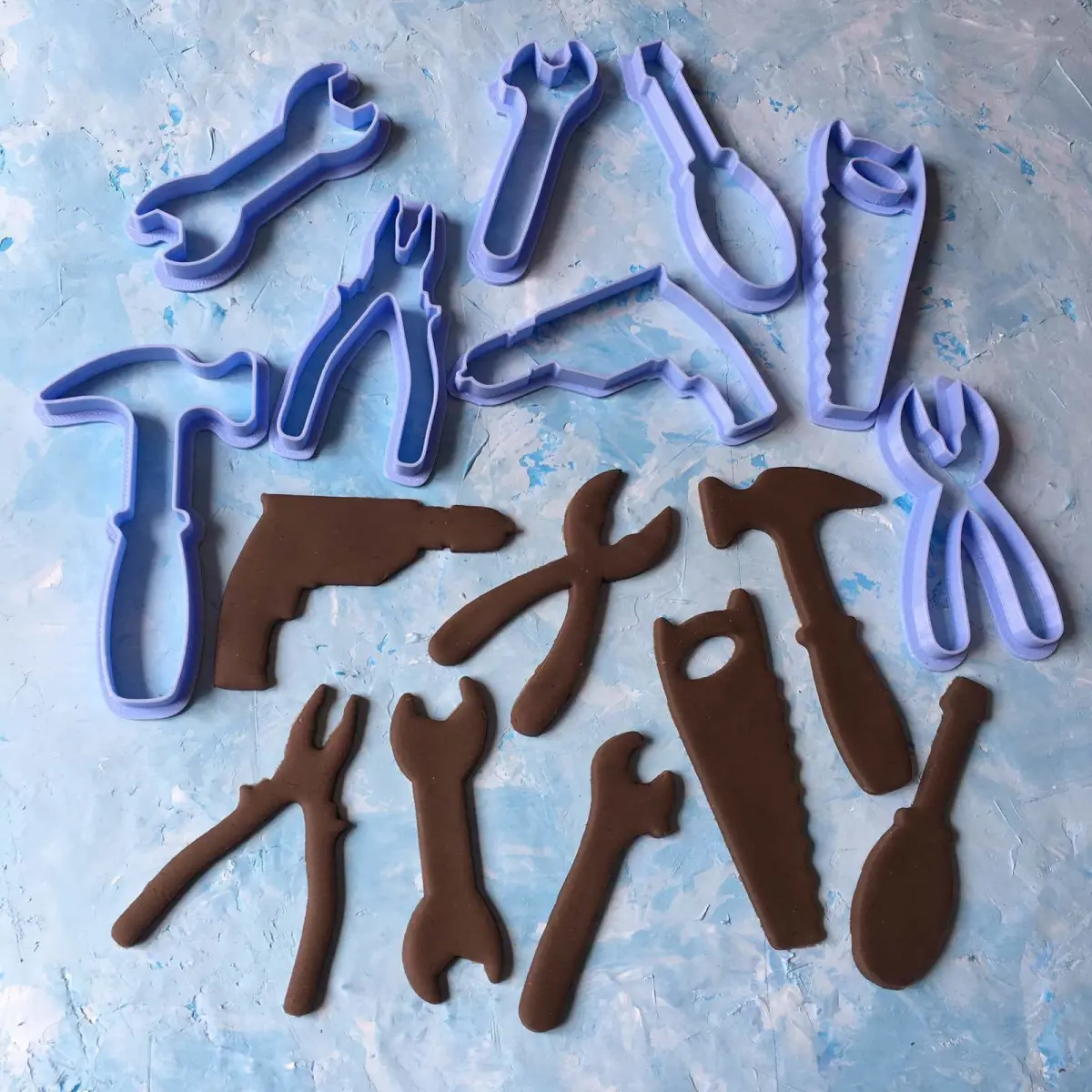 Dimensions:Pliers - 100 х 49 mmHammer - 120x69 mmScissors - 100x49 mmSaw - 120x40 mmScrewdriver - 110x31 mmWrench - 100х36 mmAdjustable wrench - 100x33 mm Drill - 70x100 mm