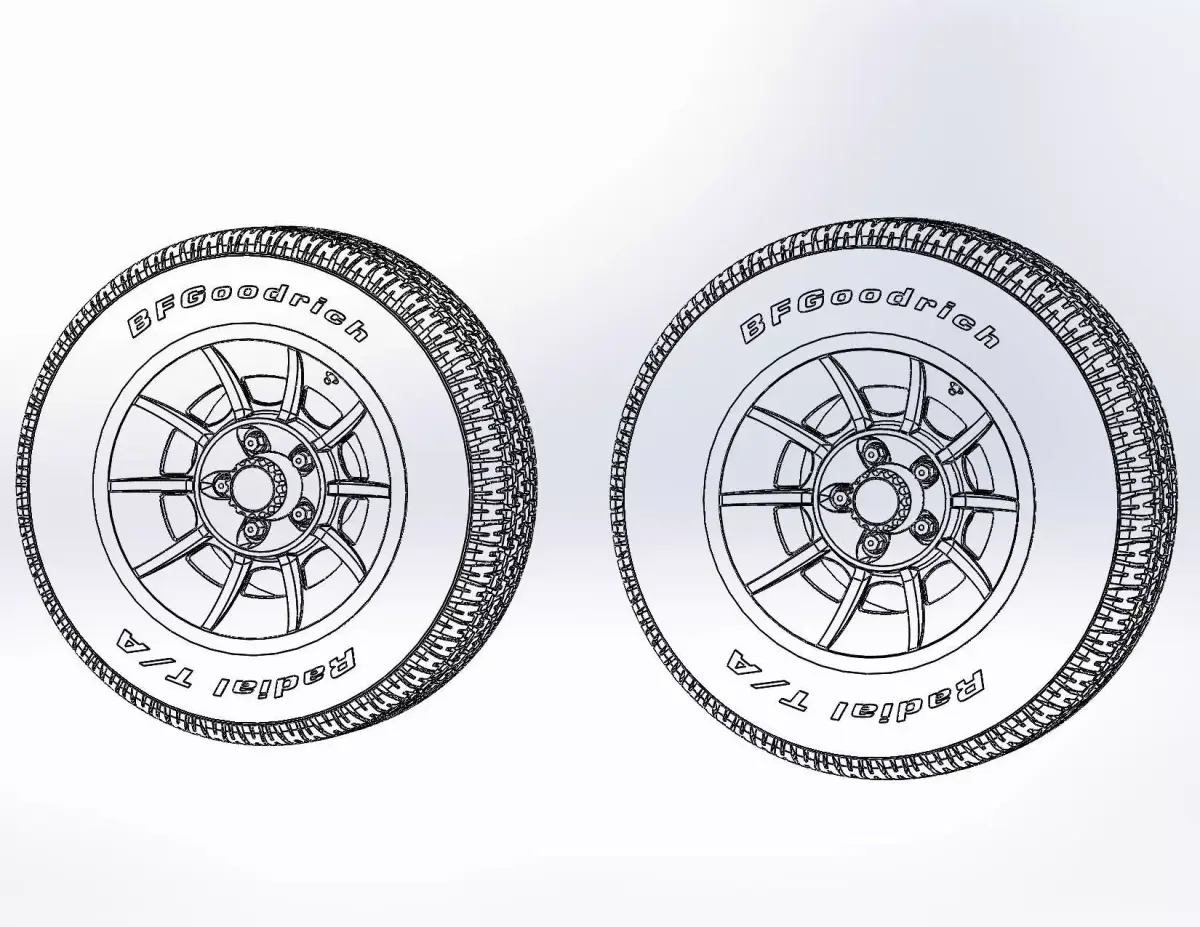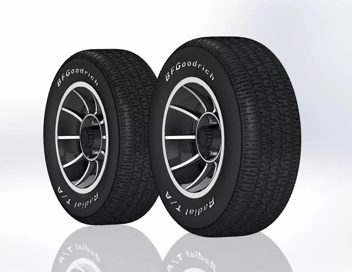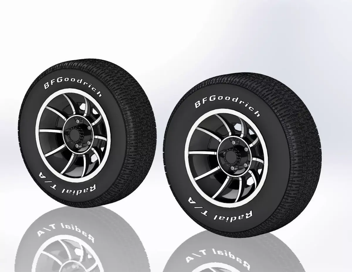 3D-printable wheels (rims and tyres separately and as one body) for your scale model . Rims American Racing VN47 Vector, front: 15x7, rear: 15x8.5. Tyres: front - 225/60 R15; rear - 255/60 R15. Tyres with a detailed tire tread pattern