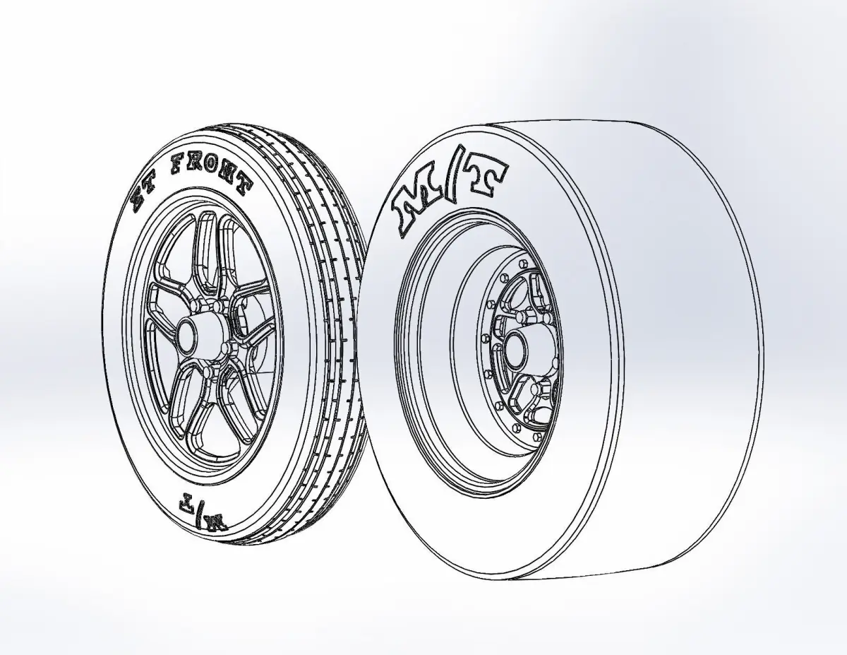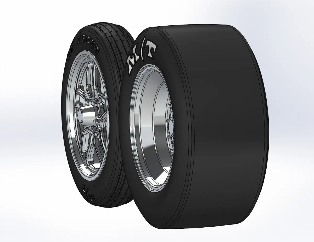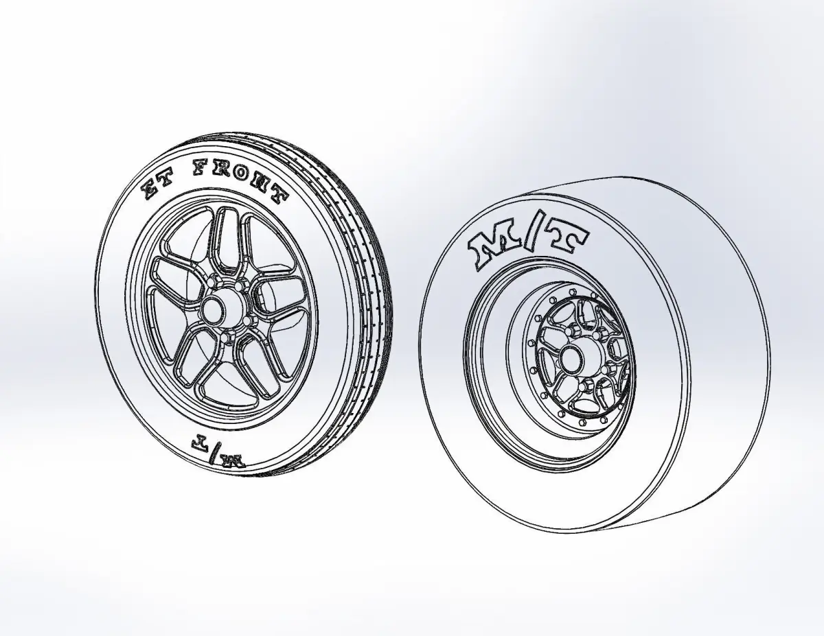 3D-printable wheels for scale model, rims and tyres separately . Rims: Billet Specialties - Comp 7: rear 15x10, front 17x4.5; Tyres: rear 26/10-15, front 26/4-17
