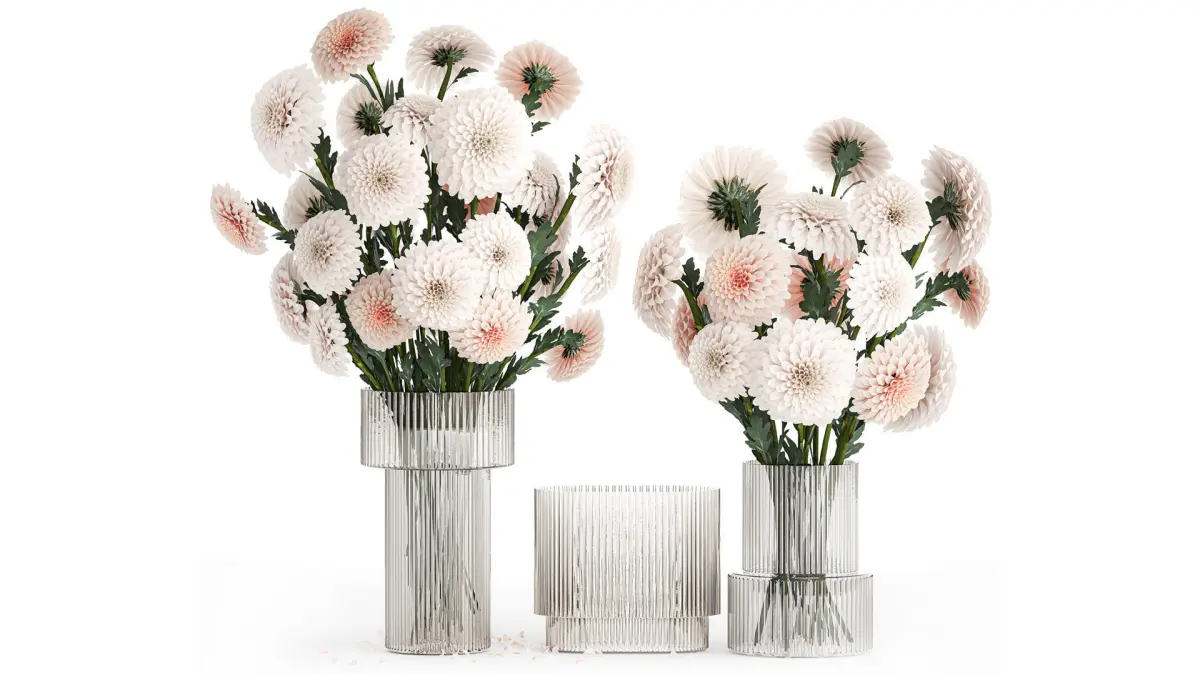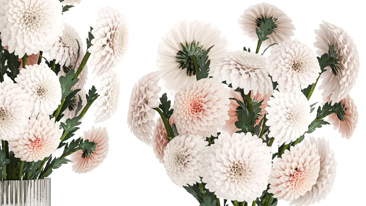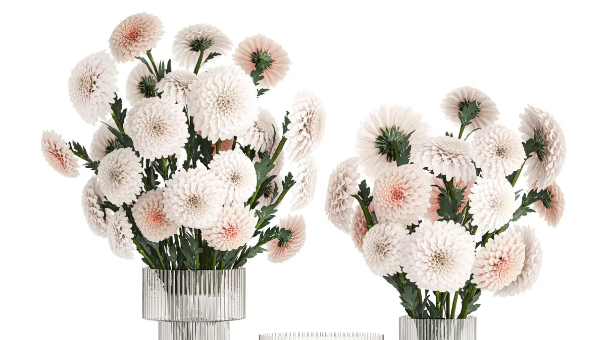 Collection of beautiful white flower bouquets in a modern glass vase from Chrysanthemum, Dahlia. Set 375.Dahlias - Dahliaschrysanthemum, golden-daisy - ChrysanthemumSpring bouquetvase - 2.hm, H&M HOME