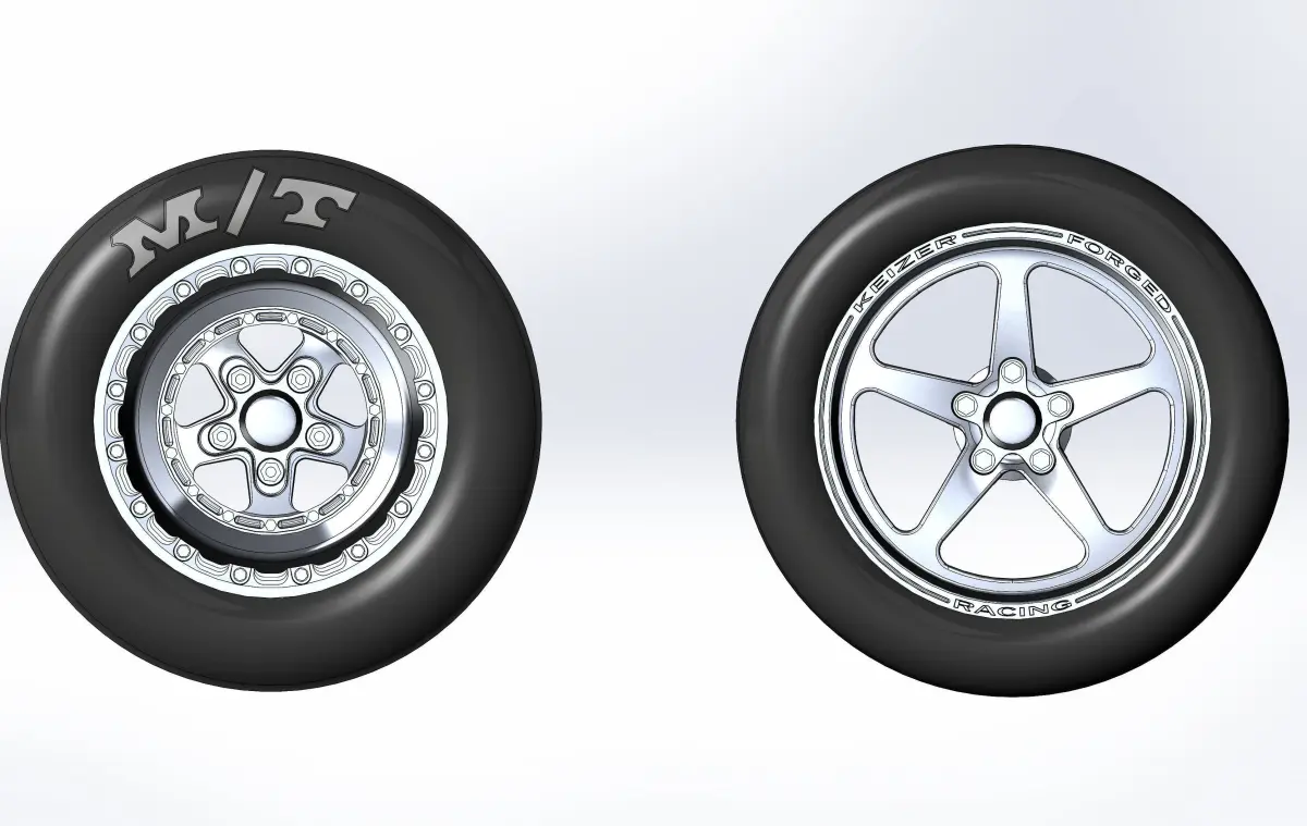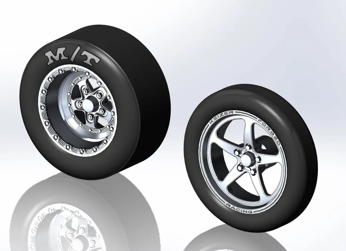 3D-printable wheels for scale model, rims and tyres separately . Rims KEIZER RACING design Full House: rear 15x9, front 17x4; Tyres: rear 25/9.5-15, front 26/4,5-17