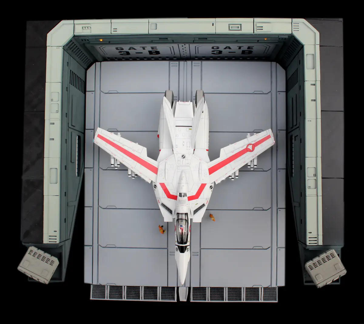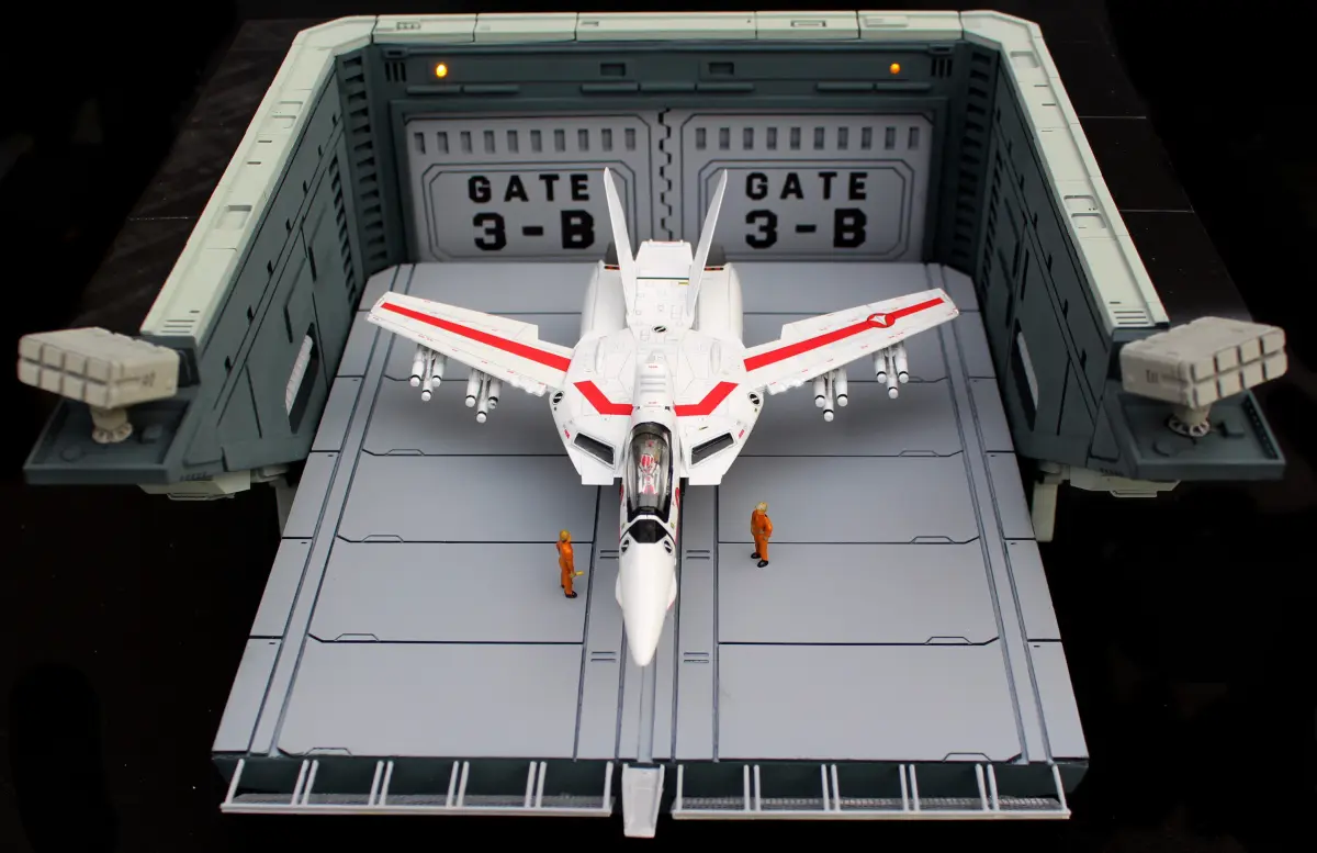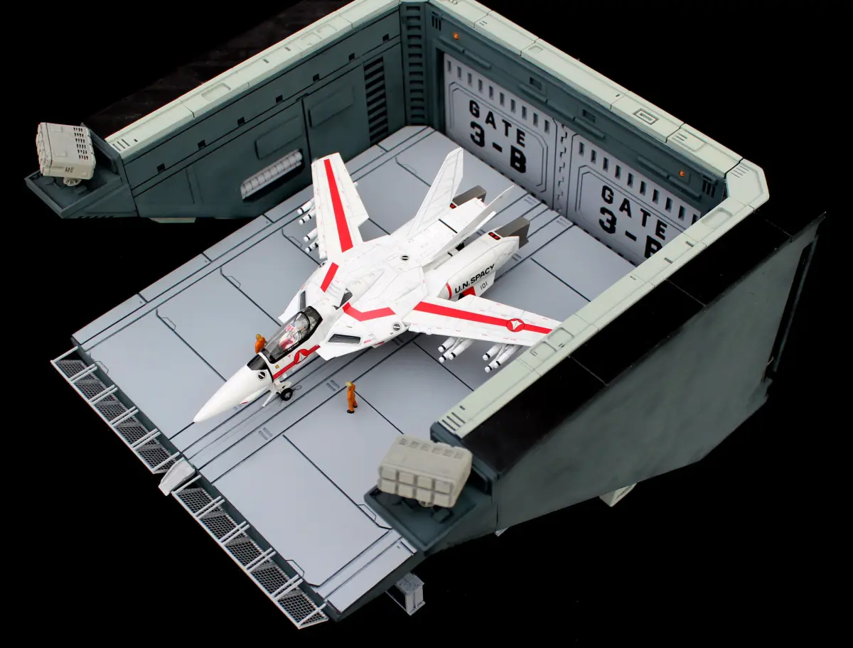 Created for 1:72 scale size VF-1 Valkyrie. (plane and figures not included). Also the elevator is glued in place and cannot move. The doors can be opened and closed.Set is 29,4 cm wide, 14,5cm heigh and 28cm deep.