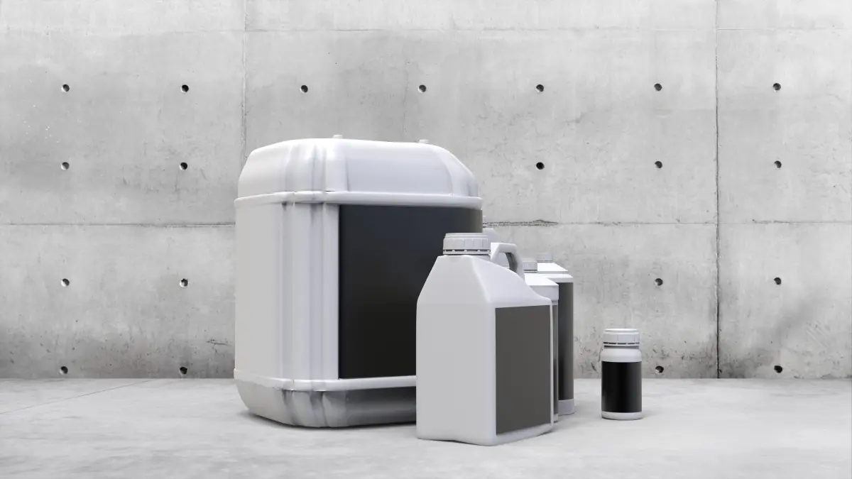 Several models of 250 cc to 20 liter bottles with labels