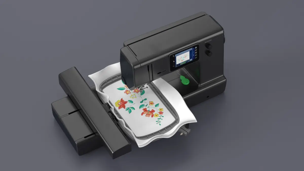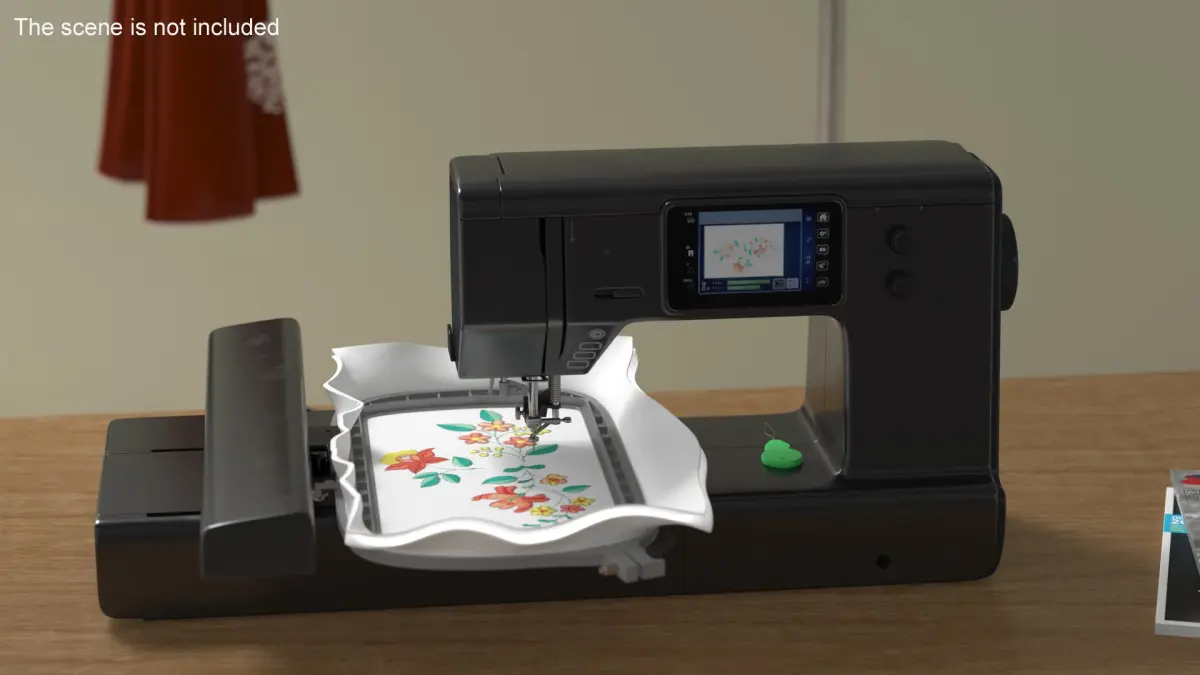 This model showcases a modern embroidery machine equipped with a digital display for selecting and customizing designs. It features a hoop for securing fabric in place and precise needle mechanisms for accurate stitching. The machine is ideal for both hobbyists and professionals, offering advanced technology for detailed embroidery work.
