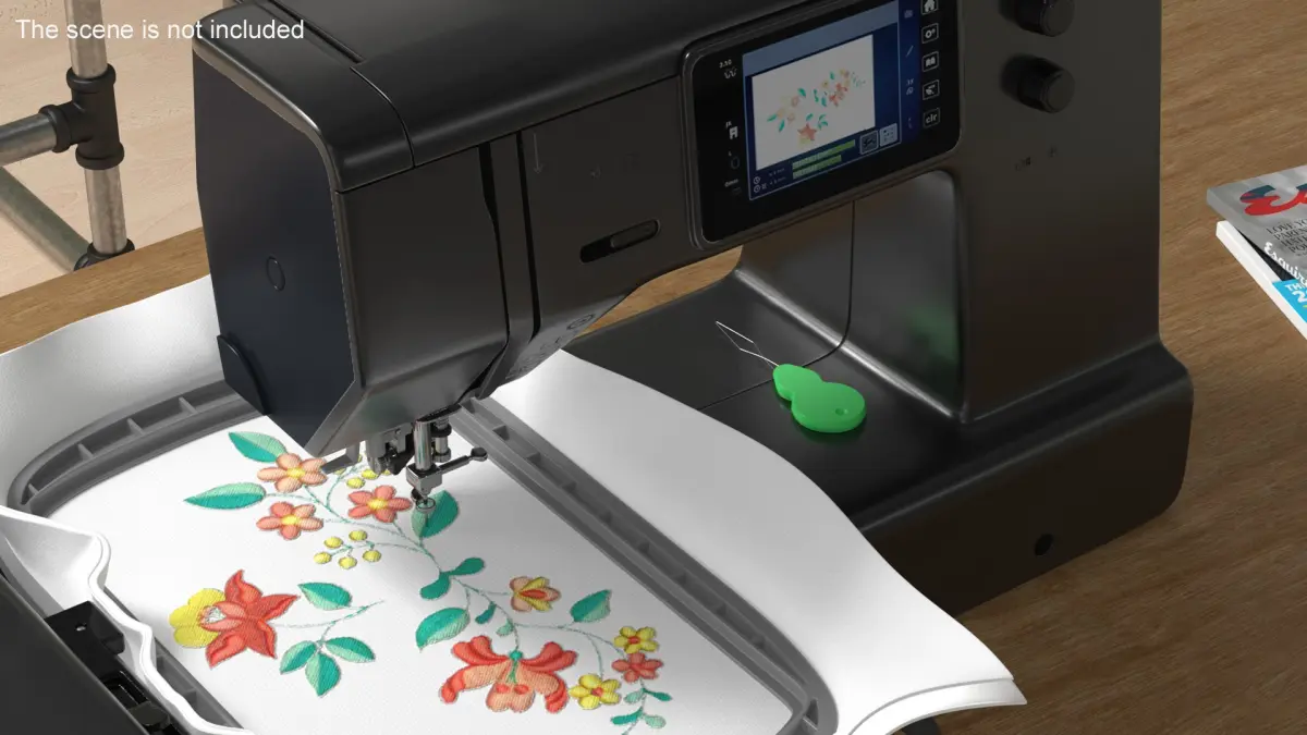 Sewing Printer with Needle Threader Rigged is a three-dimensional model of black embroidery machine that is a sophisticated sewing device designed for creating intricate embroidered patterns and designs on fabric.