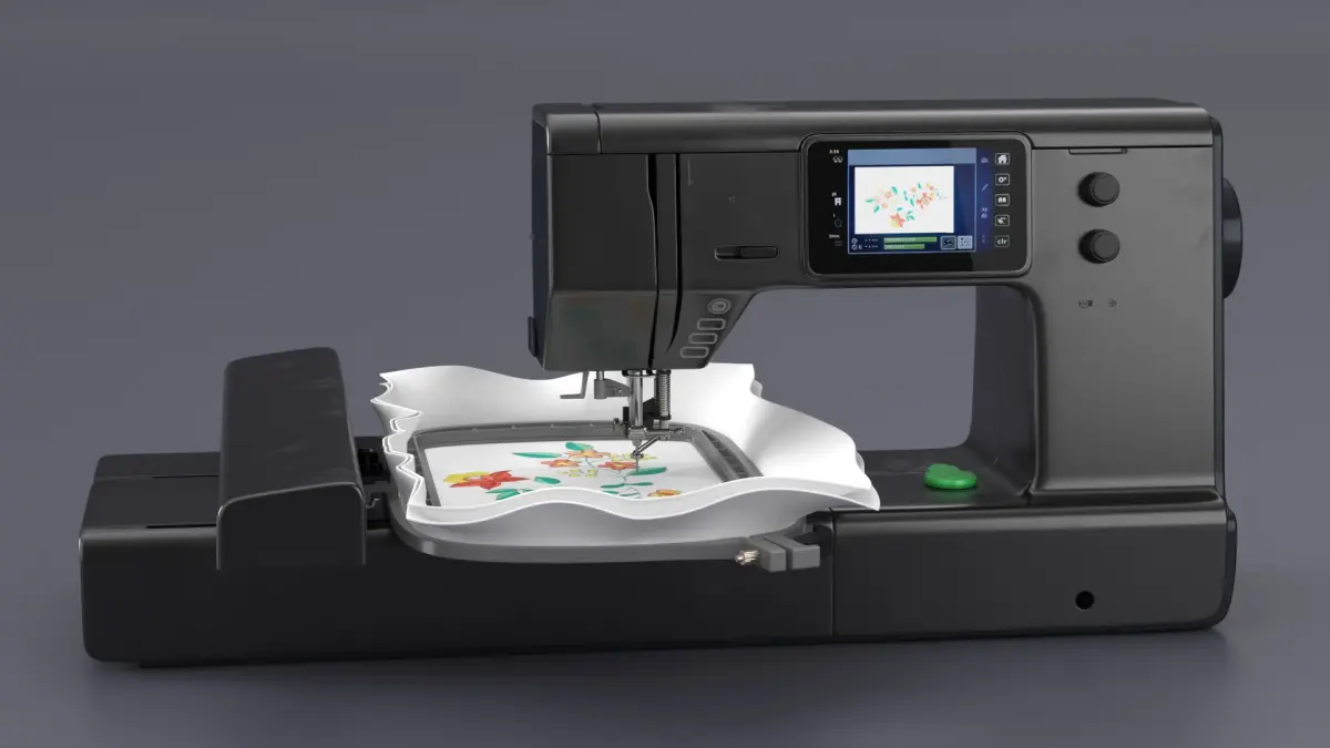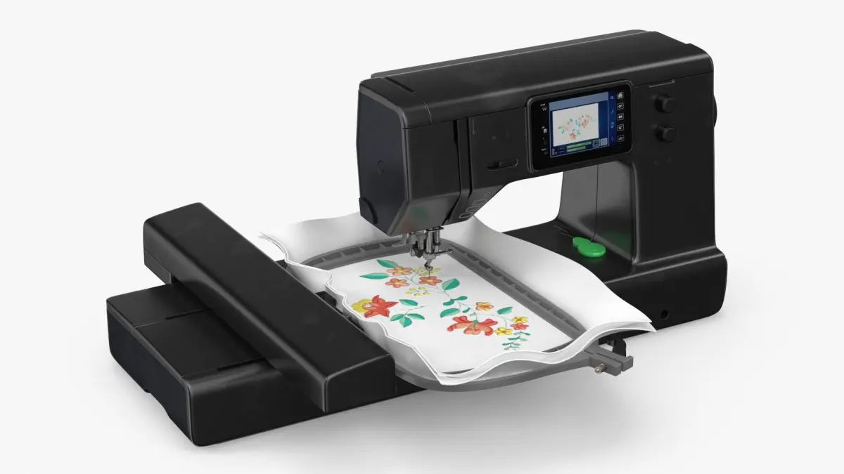 This model showcases a modern embroidery machine equipped with a digital display for selecting and customizing designs. It features a hoop for securing fabric in place and precise needle mechanisms for accurate stitching. The machine is ideal for both hobbyists and professionals, offering advanced technology for detailed embroidery work.
