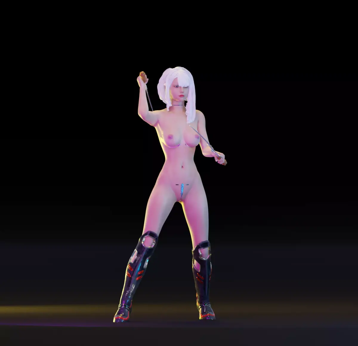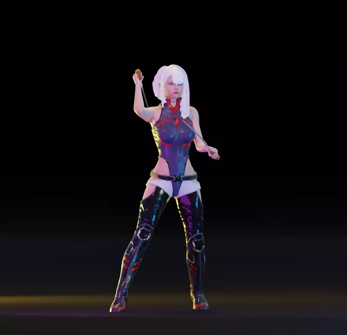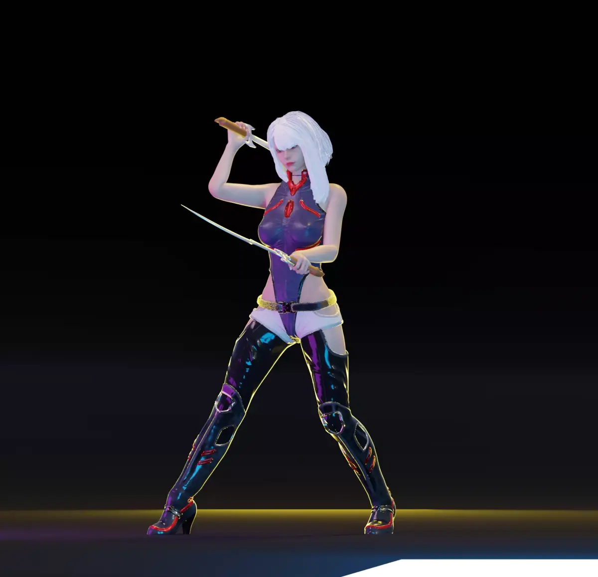 Futuristic female sword warrior character posed in a dynamic combat stance, wielding dual blades. The model features a sleek, science-fiction–inspired outfit with form-fitting armor elements, high-detail surface work, and a stylized humanoid anatomy. The character design blends cyberpunk and sci-fi aesthetics, making it suitable for games, animations, cinematic renders, collectibles, or concept visualization. Ideal as a standalone display piece or as a base for further customization and rigging workflows.