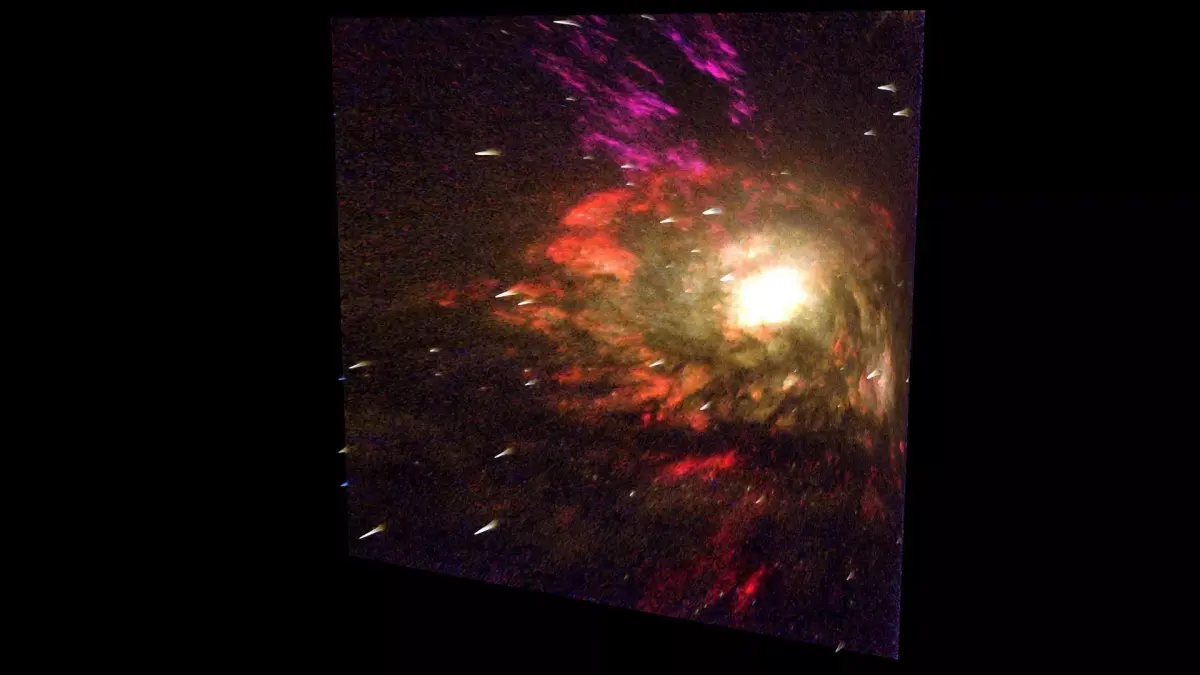 Model is a set of particle systems with elements of different types. Since real Seyfert Galaxy contains hundreds of billions stars, there are no way of simulate realistic view of galaxy directly. So here used textured particles with complex materials, placed along structural parts of Galaxy. Some of them are “clouds” of stars, others are light absorbing dust, emitting hydrogenous clouds, individual super-giant stars, etc. Multi-layered complex shaders was specifically designed to retain detailed and realistic view with extreme closeup and inside-the-galaxy views