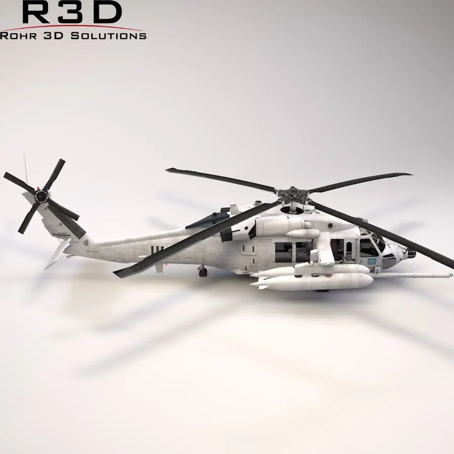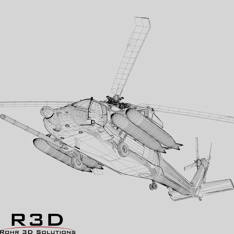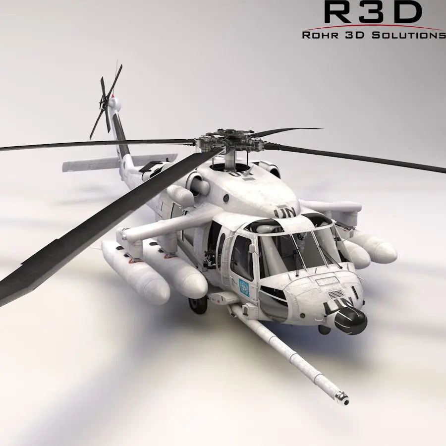 This model is native to Cinema 4D and contains files in OBJ, FBX, VUE, 3DS. It features a United Nations Special/NATO Forces Paint Scheme. The Sikorsky SH-60/MH-60 Seahawk is a twin turbo shaft engine, multi-mission United States Navy helicopter based on the United States Army UH-60 Black Hawk and a member of the Sikorsky S-70 family. The most significant airframe modification is a hinged tail to reduce its footprint aboard ships. This model has a moderate amount of detail in the exterior emulating the UN Special Forces arrangement that can be broken down to a simplified SH-60 Seahawk. All components can be easily removed for multiple types of rendering and animation applications. This model has 2 main rotor components as a droop static or lifted flying blade that will compliment any motion blur image or animation.