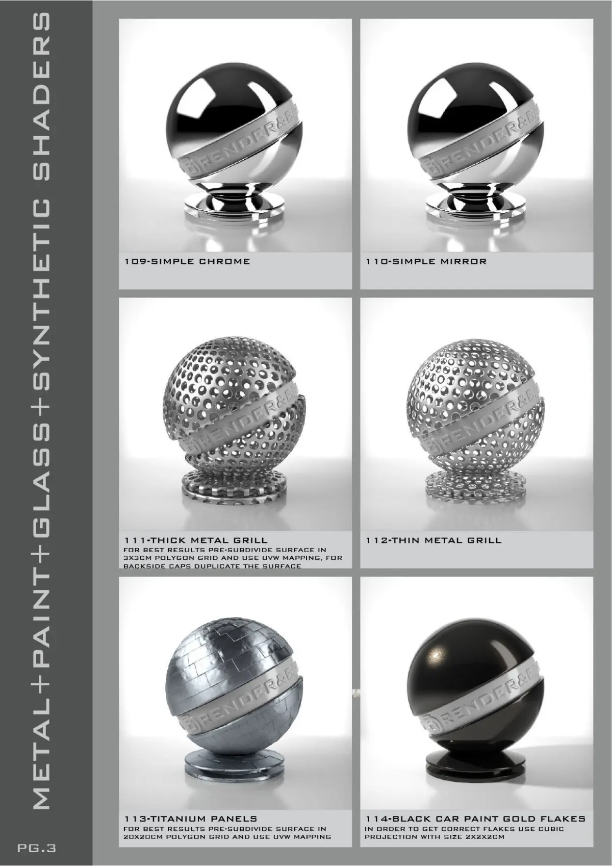 3DRnB SHADERS FOR VRAYFORC4D- Bundle 03 Metal-Paint-Glass-Synthetic is a collection of 55 Shaders ready to use in Cinema 4D.
