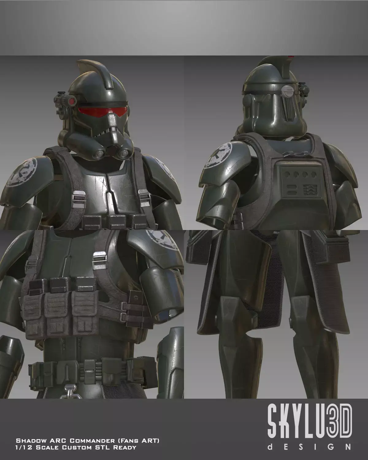 Custom Shadow ARC Commander armor sculpted for 1/12 scale Clone Trooper bodies. This unique design is fan art inspired and optimized for 3D printing, giving Black Series collectors a distinctive squad leader option for display or diorama builds.