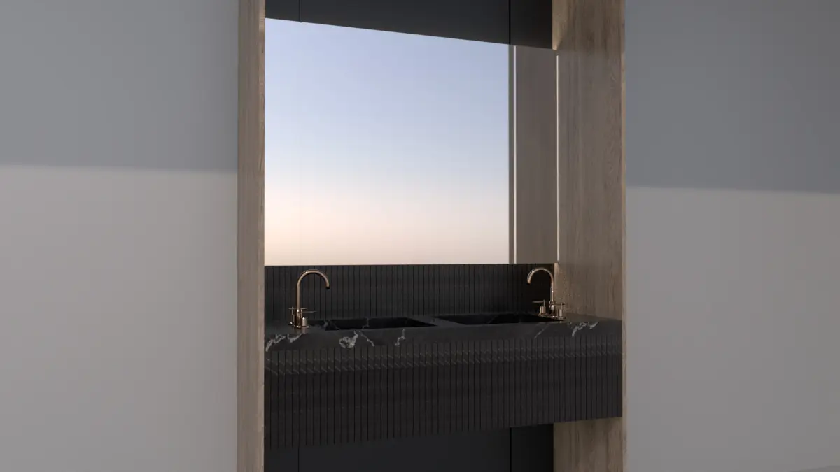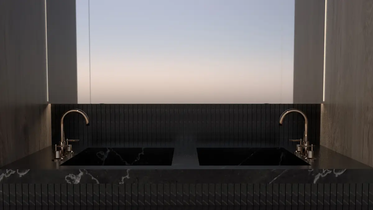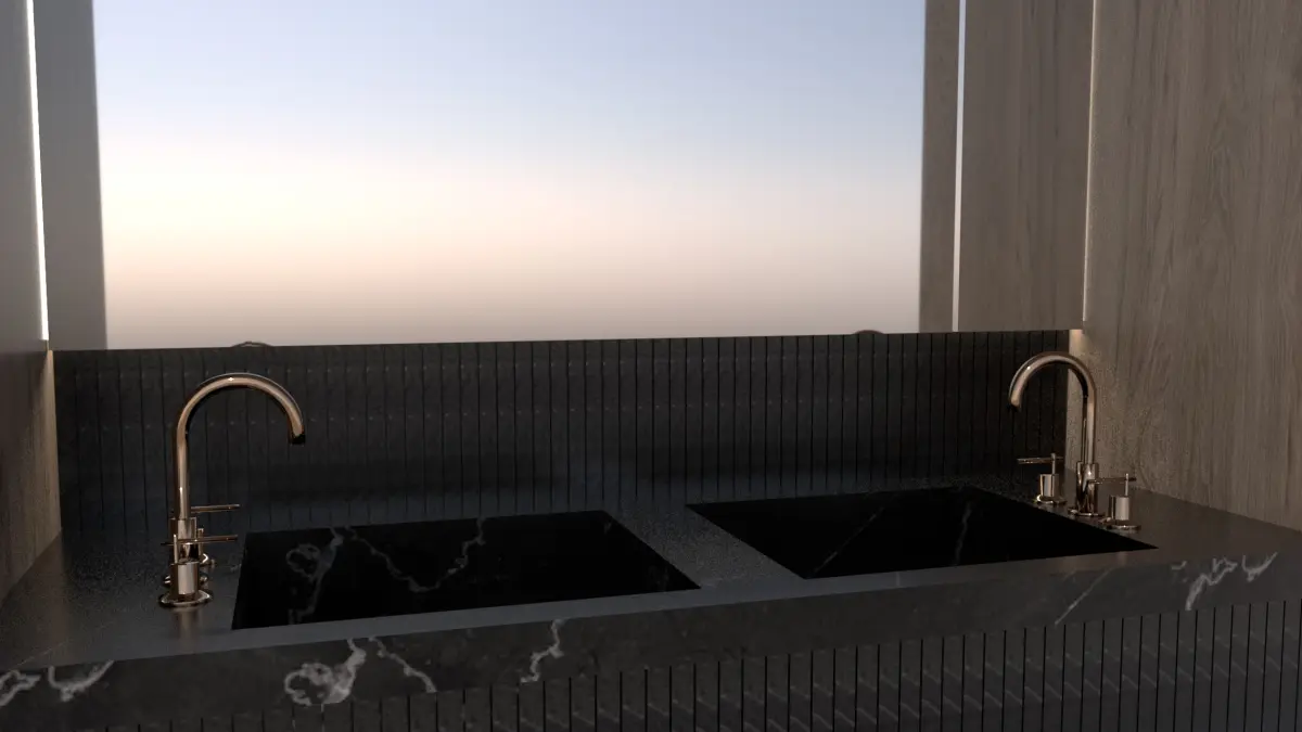 The high-end brushed brass faucets and sleek minimalist aesthetic make it ideal for upscale residential or hospitality interior renders. This model is perfect for photorealistic bathroom visualizations, architectural presentations, and interior design scenes.