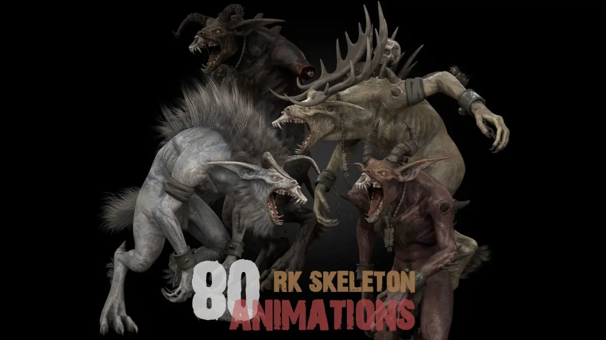 80 Animations(Idle: 6, Walk: 11, Run: 10, Jump: 10, Attack: 15, GetHit: 15, Move: 6, Death: 3, Scream: 4)All RK Skeleton-based animations are interchangeable.